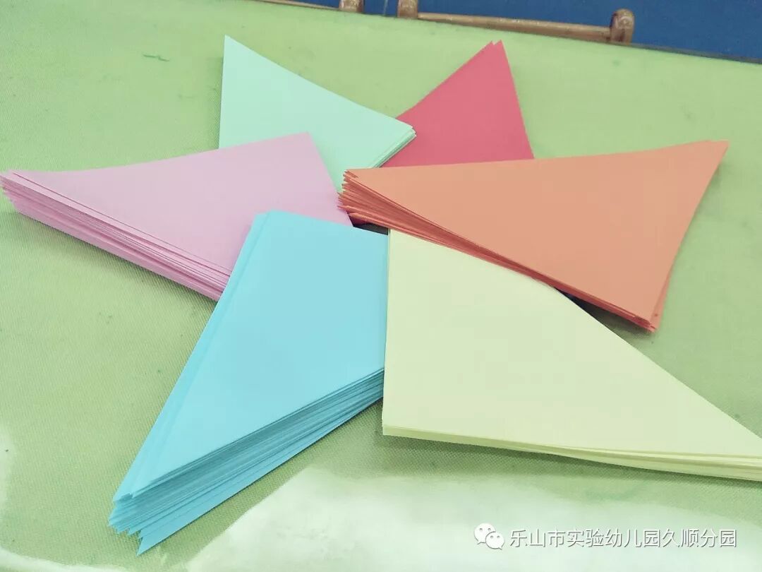 将正方形彩纸对折两次变成小三角形,用剪刀从小角处开始剪同一边,然后正着黏一个,反着黏一个,哇塞,变成能转动的拉花了
