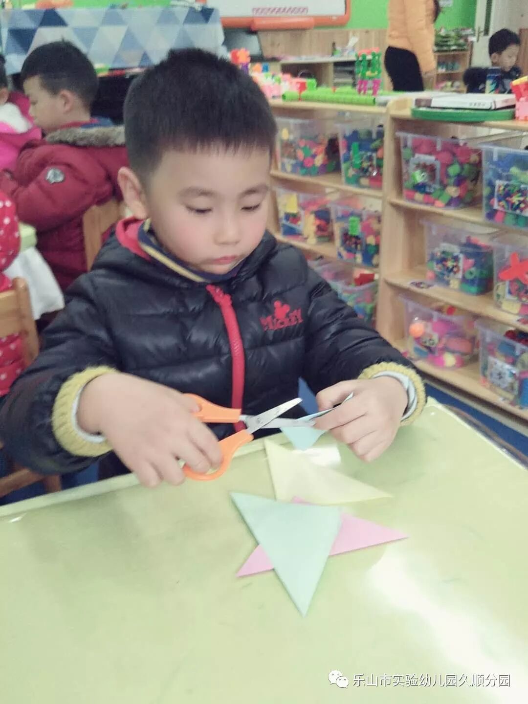 将正方形彩纸对折两次变成小三角形,用剪刀从小角处开始互错着对剪,铛铛铛铛,正方形拉花做好啦,小手捏着上下的正方形中间,一拉,哇!好漂亮
