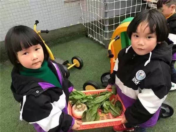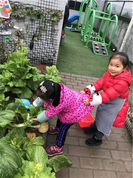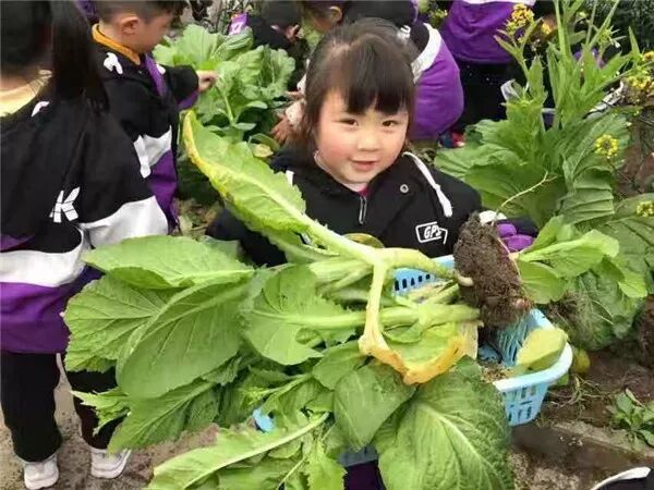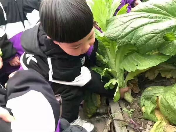 说完就开始动手摘菜,一个个瞪大眼睛,挥动小手,挑大的青菜,抓住根部连根拔起。有小朋友发现青菜太大,一个人拉不动,后面的小朋友就一起帮着拉,把青菜拉起来以后,还像模像样抖掉菜上的泥土,放进篮子里。很快,菜地里的青菜被摘完了。