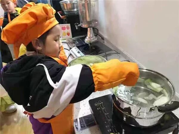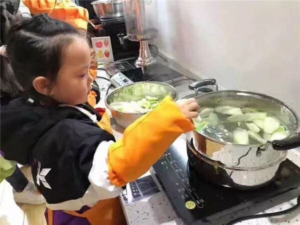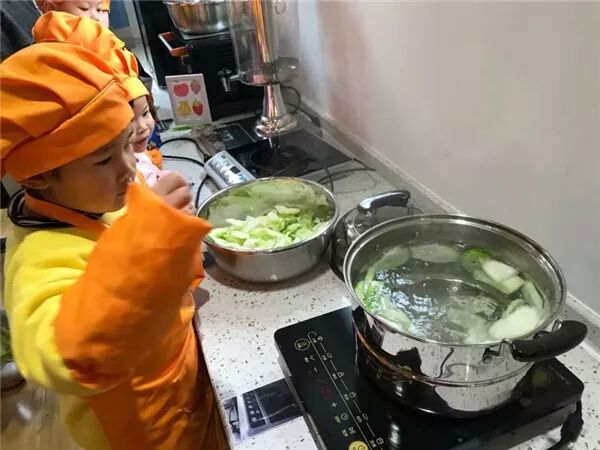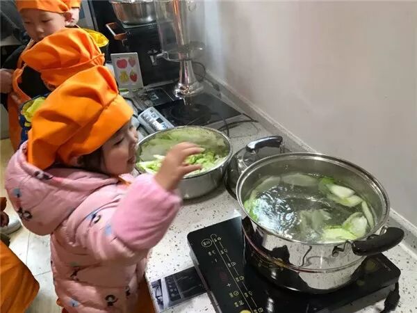接下来清洗、切菜、下锅煮菜,不一会儿,教室里满是香味。