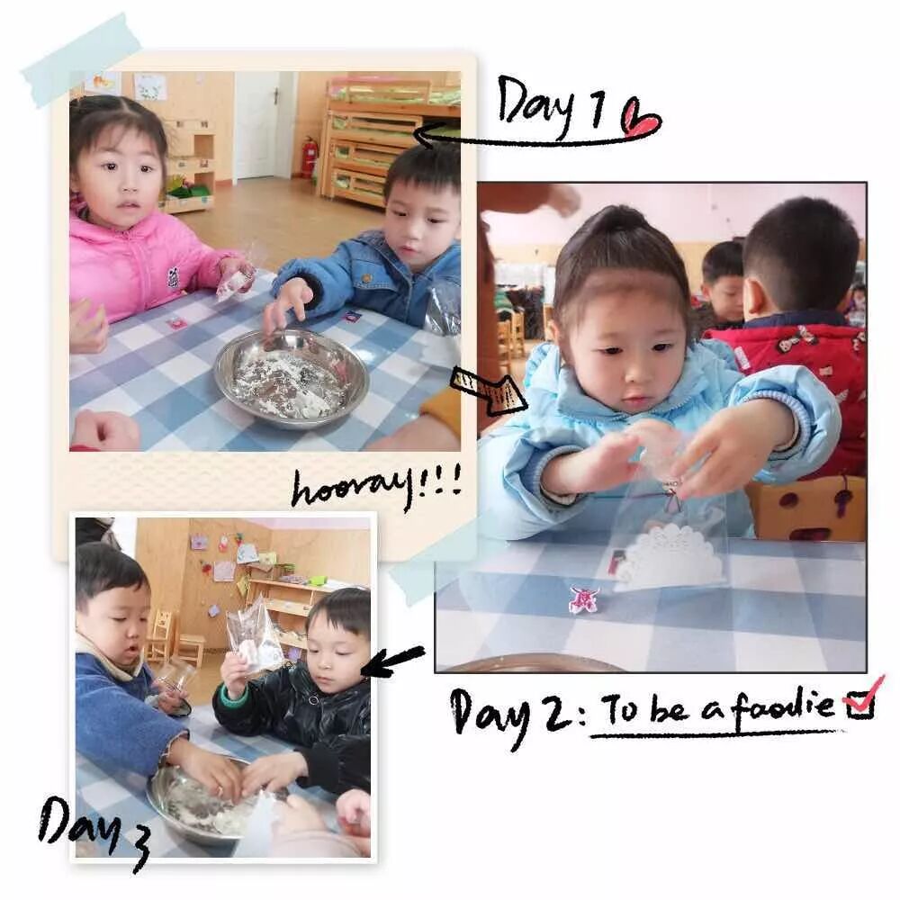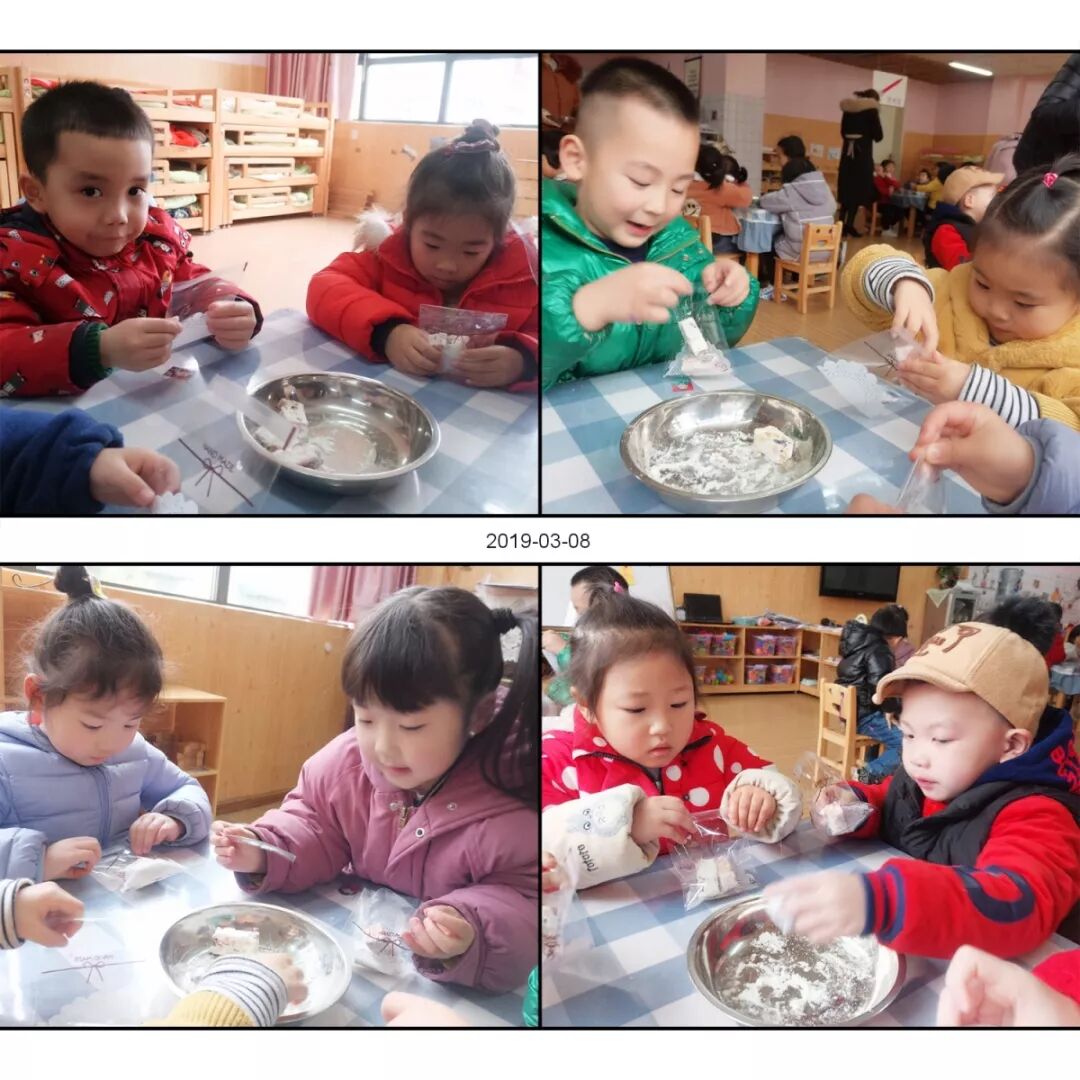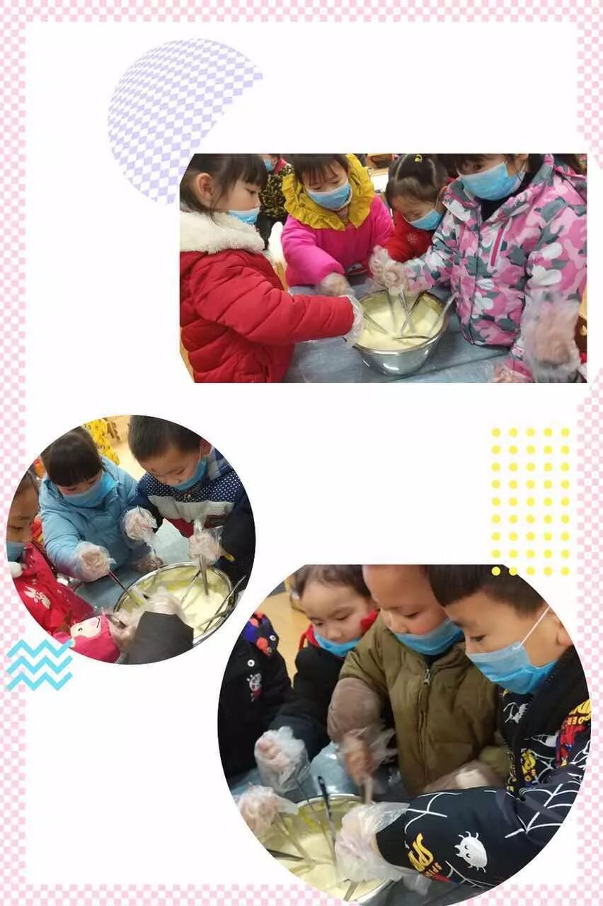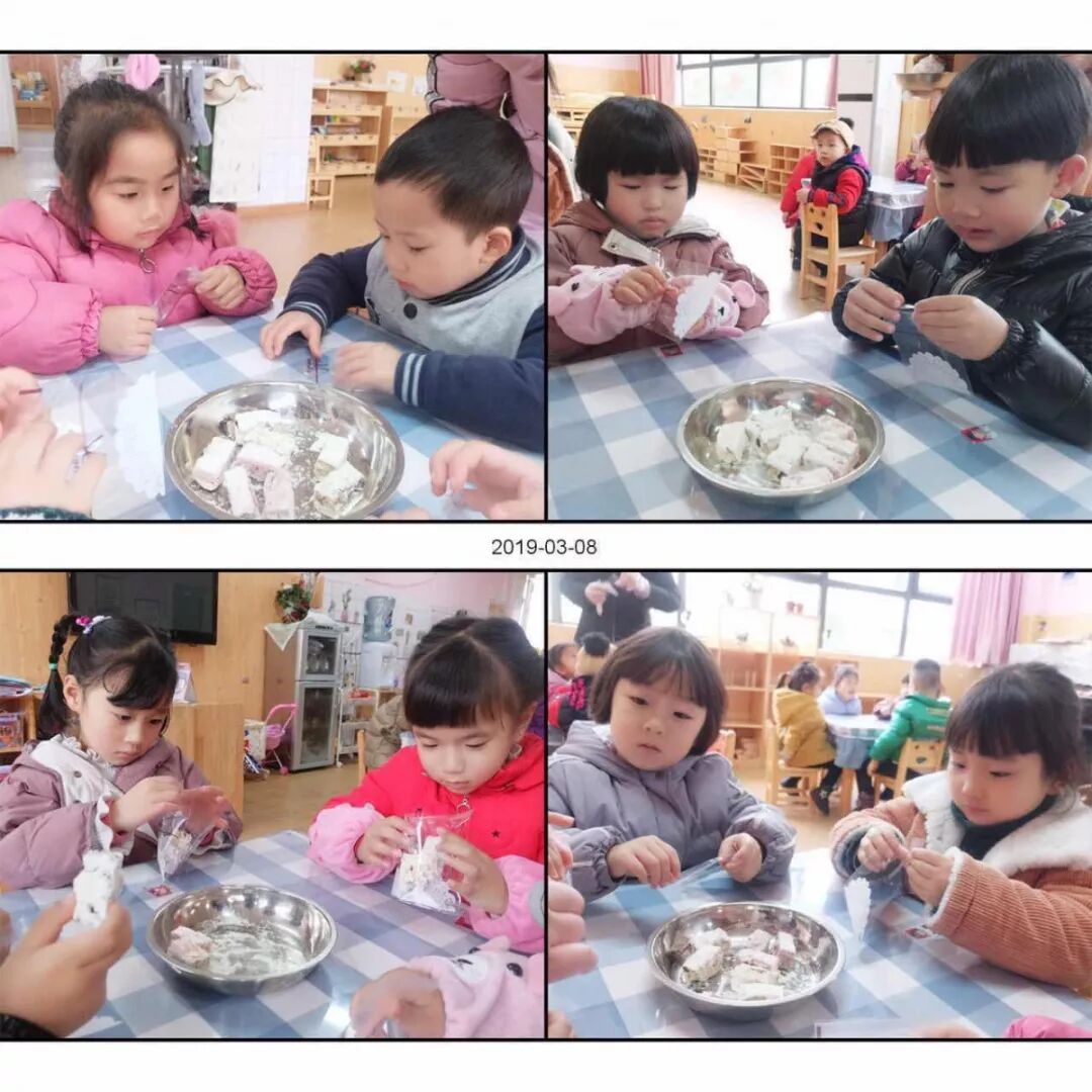 老师在教我们做雪花酥,我们要把甜甜的雪花酥送给妈妈!