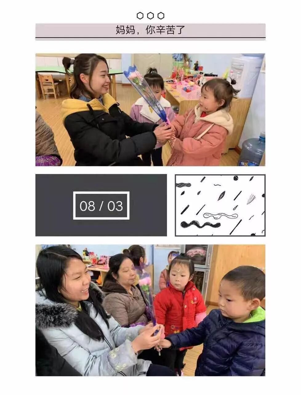 初春的柔风,送来了亲情最浓的“三八”妇女节。又是一次情意浓,伴着习习春风,丝丝情谊,孩子们把自己精心准备和制作的礼物送给亲爱的妈妈们! 礼物有大有小,样式各异,却都包含着对妈妈们浓浓的爱意!