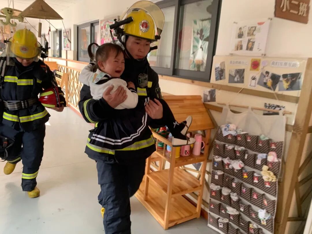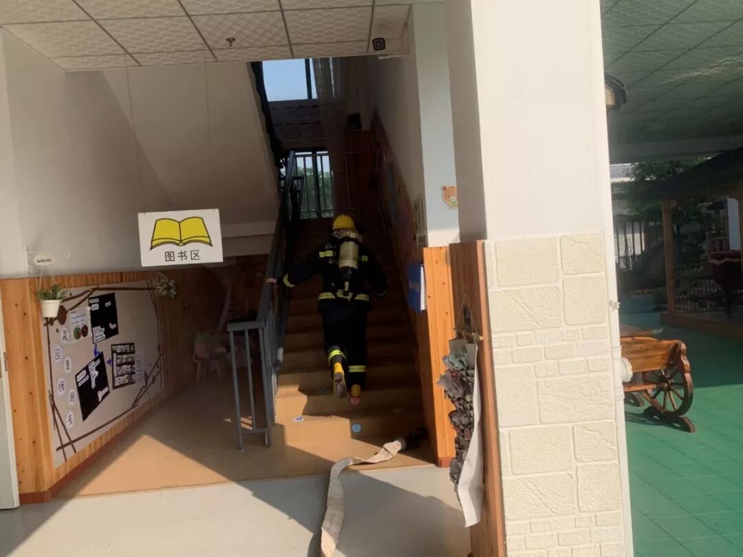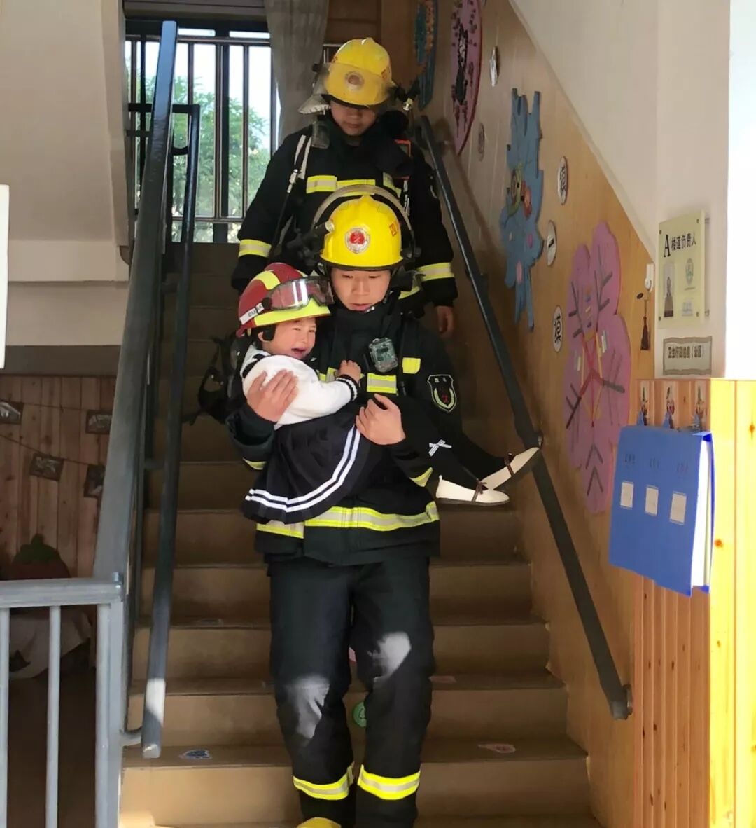 只见英勇的消防员叔叔身穿防火服,手拿水管冲上幼儿园二楼救下了被困的小朋友并扑灭了大火。