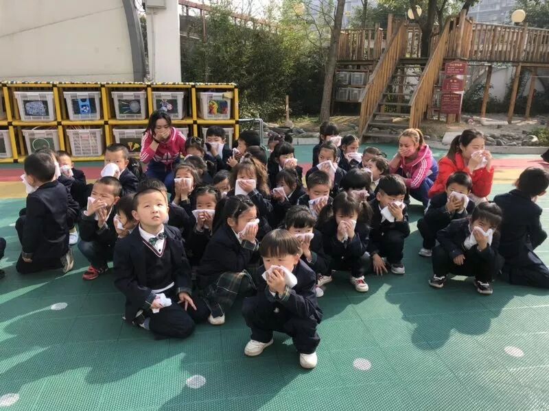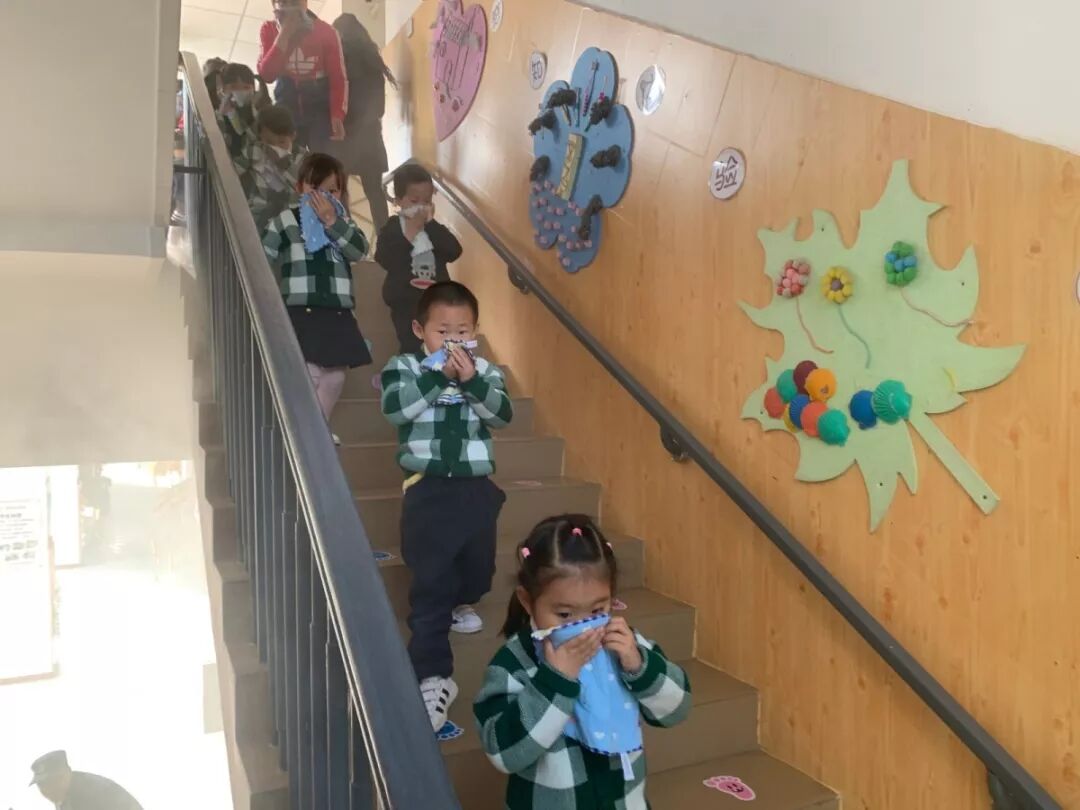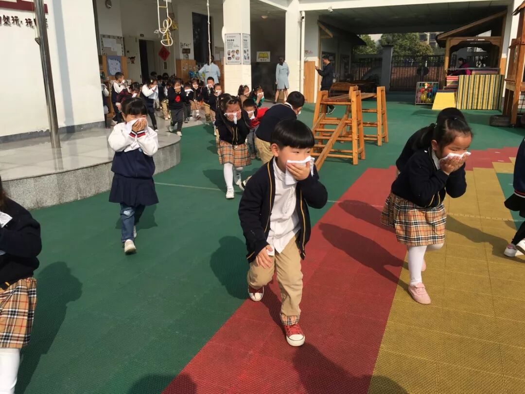 上午十点,市实幼高新区分园浓烟四起,警报拉响,危险的火灾发生了,全体老师和幼儿拿起湿毛巾,捂住口鼻,蜷缩着身子,井然有序地按照消防逃生路线来到安全场地——操场!