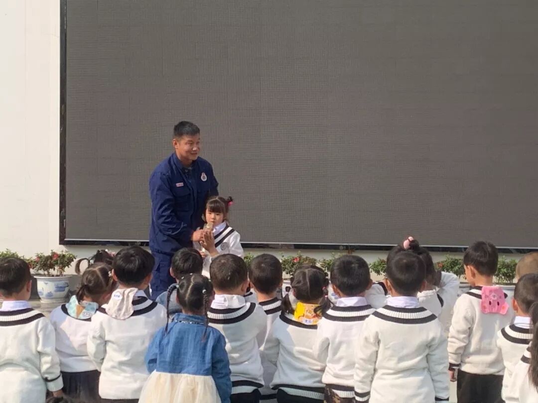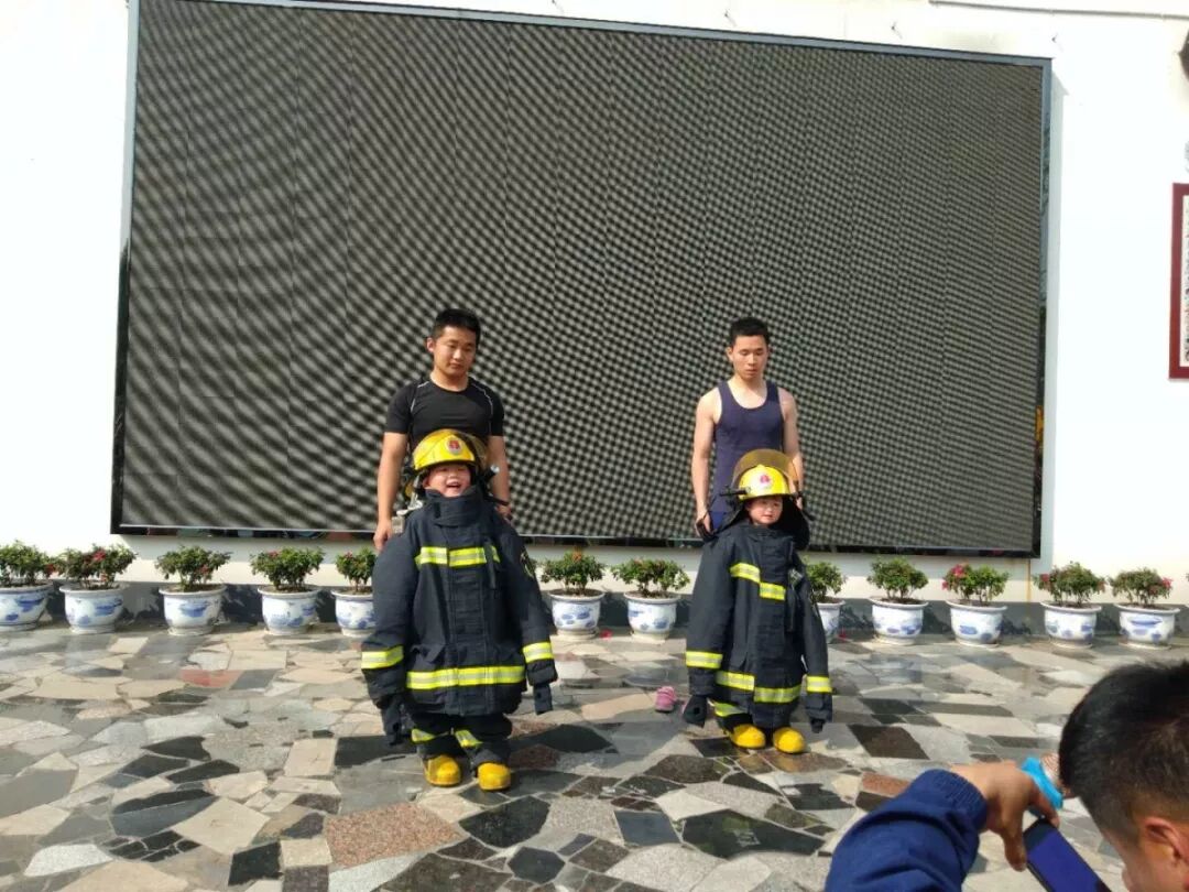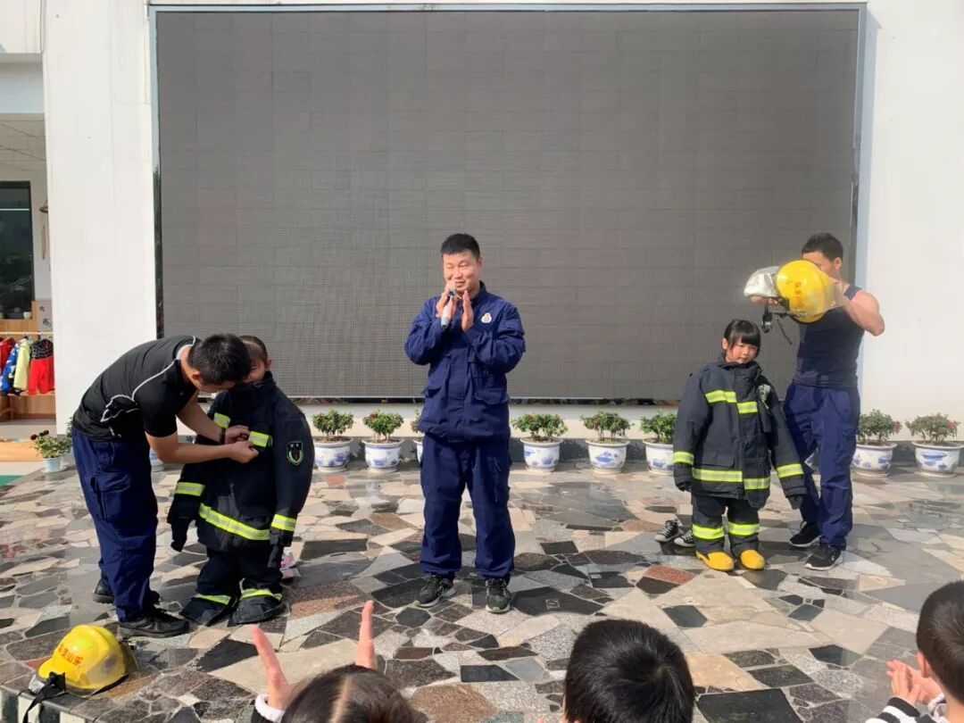 消防员叔叔还为小朋友们讲解安全消防知识,让孩子们亲身体验消防服与我们平时所穿服装的不同。