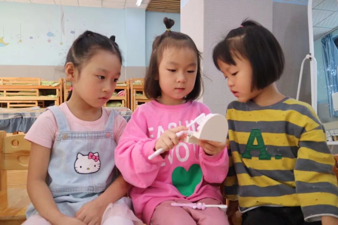 小朋友拿出自己的牙刷和牙医姐姐一起刷牙,掌握正确的刷牙方法。