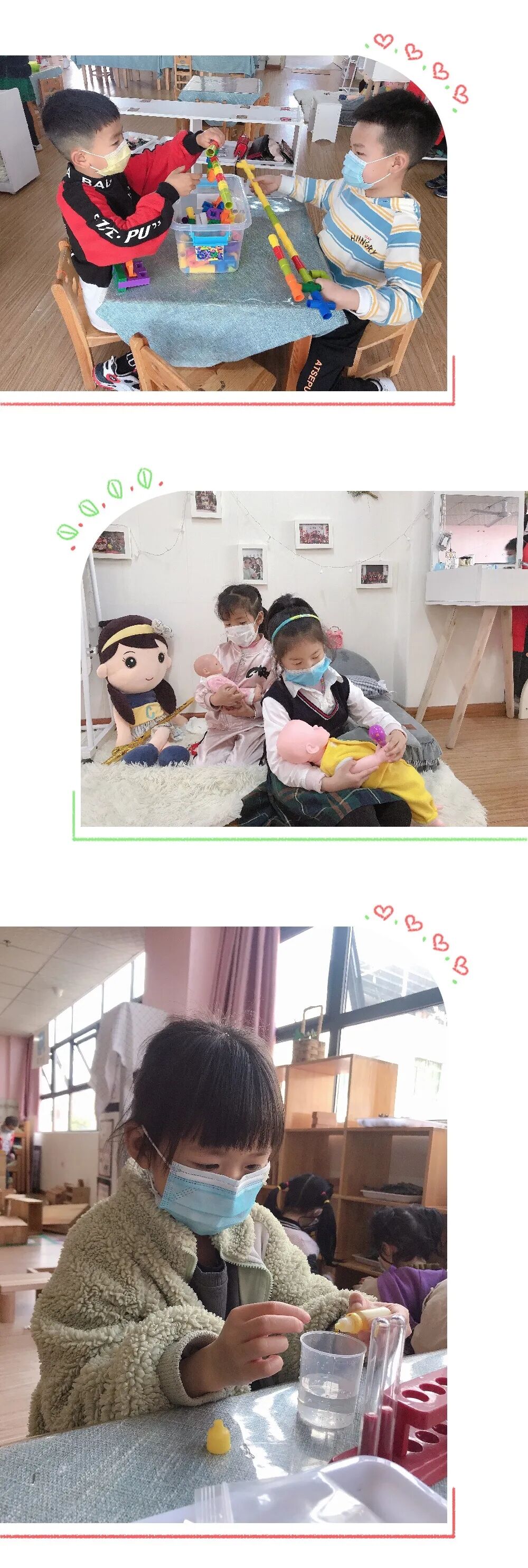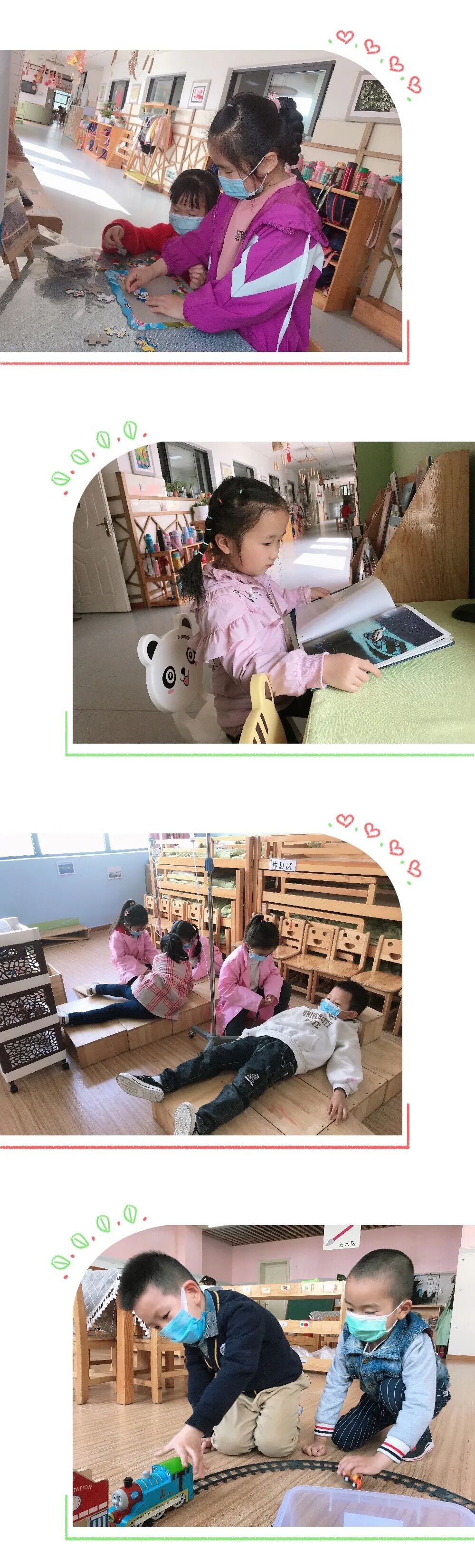 教室里,是久违的孩子们的欢声笑语,图书区、艺术区、家庭区、积木区、玩具区,每一处都能寻到他们认真的身影。