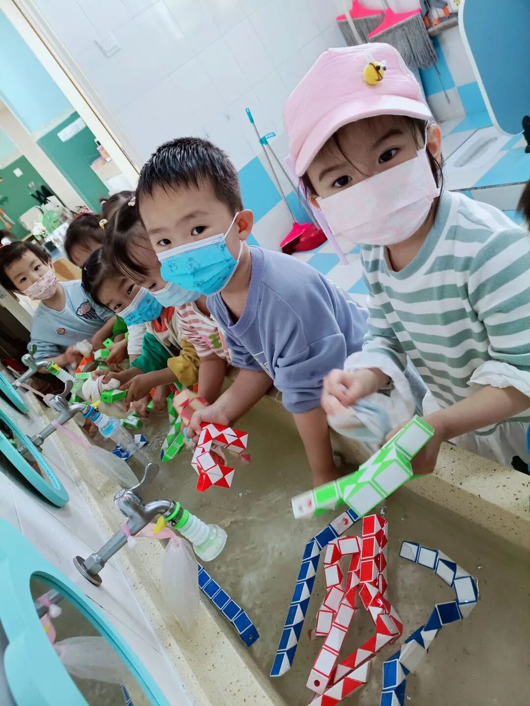 大二班宋筱小朋友:我们在沙水区打扫卫生,我们给水池洗了澡,使劲的冲洗,水池变得很干净了。