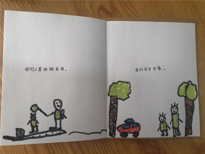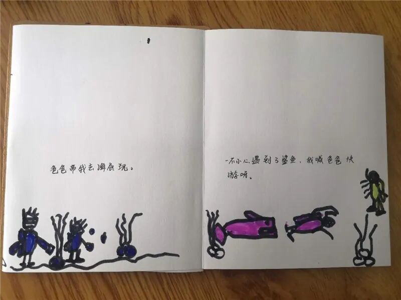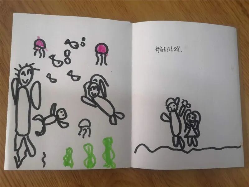 宸宸:爸爸带我去海湾,爸爸在晒太阳,我在堆城堡。爸爸带我去海底玩,一不小心遇到了鲨鱼,我喊爸爸快游呀。后来,我和爸爸在海底捞鱼,我们把捞到的鱼放进了袋子里。然后,我们上岸了收拾东西,坐车回到了家。