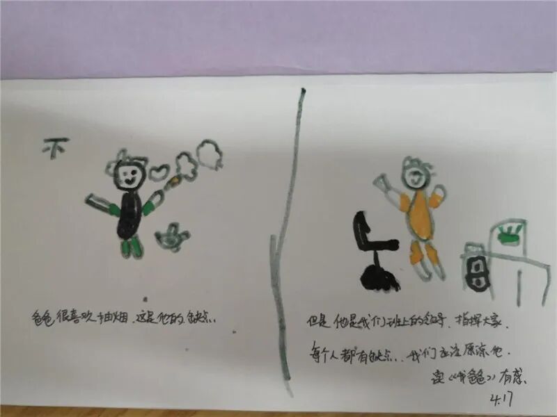 有的孩子说:爸爸很喜欢抽烟,这是他的缺点。但是他是我们班上的领导、指挥大家,每个人都有缺点,我们应该原谅他。