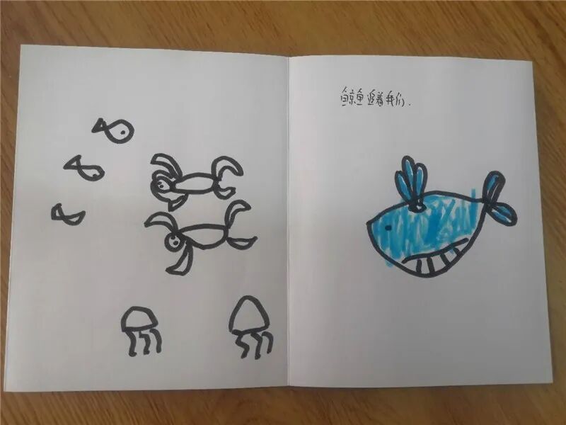 笑笑:我和爸爸去海洋馆,我学到了很多知识,他很开心。我们来到沙滩去游泳,遇到了鲸鱼,鲸鱼追着我们,我们拼命的游呀游呀,终于游到了岸上,躲过了鲸鱼的追捕。