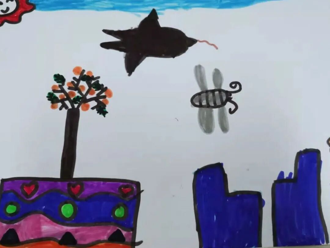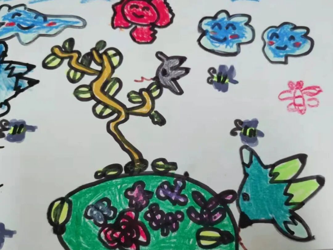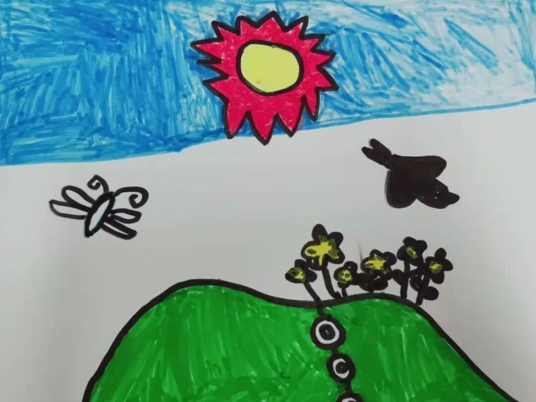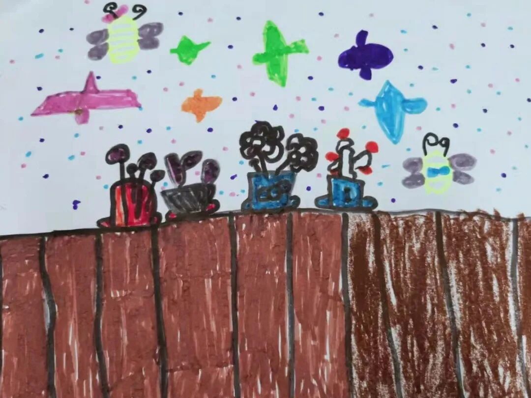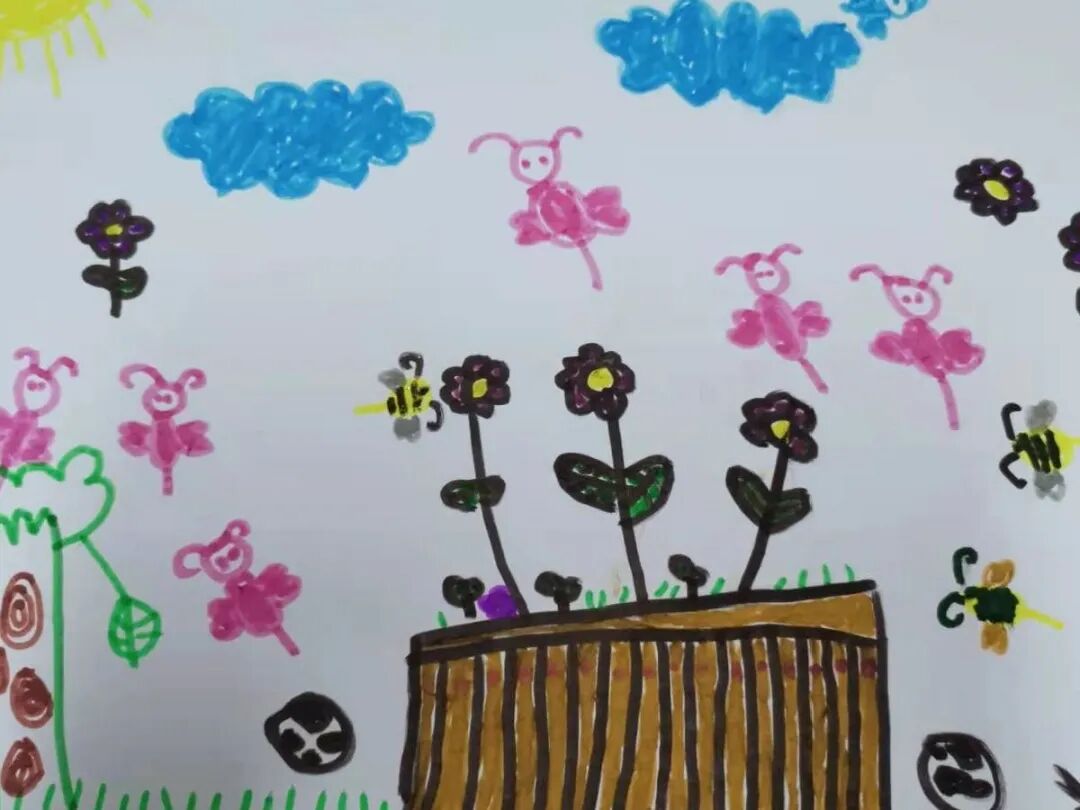 李茹薏:这是我画的幼儿园的大门口的花台,上面的花都开了是粉色的还有好多蝴蝶都来了,好漂亮。