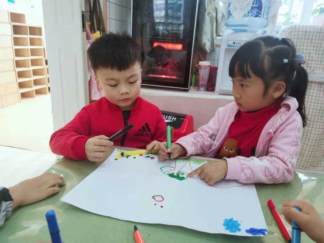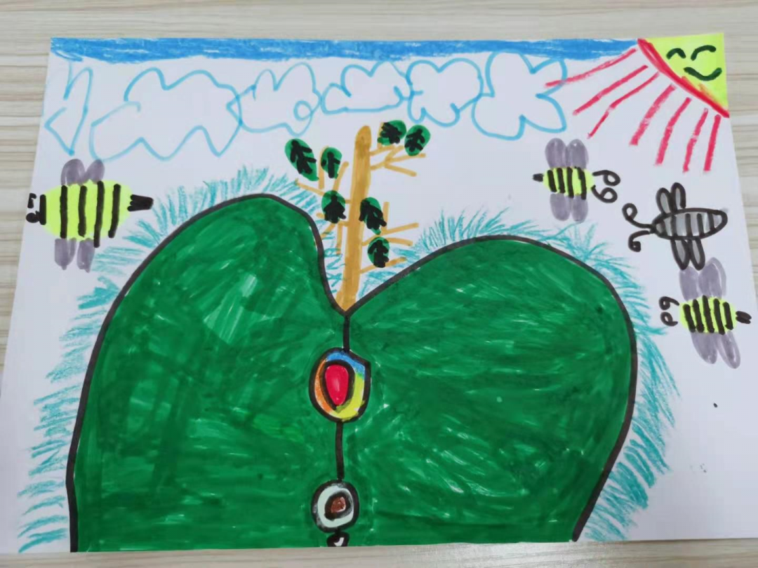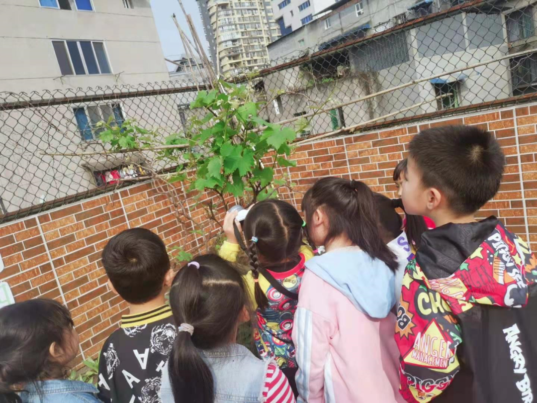 缪欣蕊:这是幼儿园的小山坡,橘子树花开了,春天到了小树都发芽了,还有蝴蝶和蜜蜂,今天天气很好~