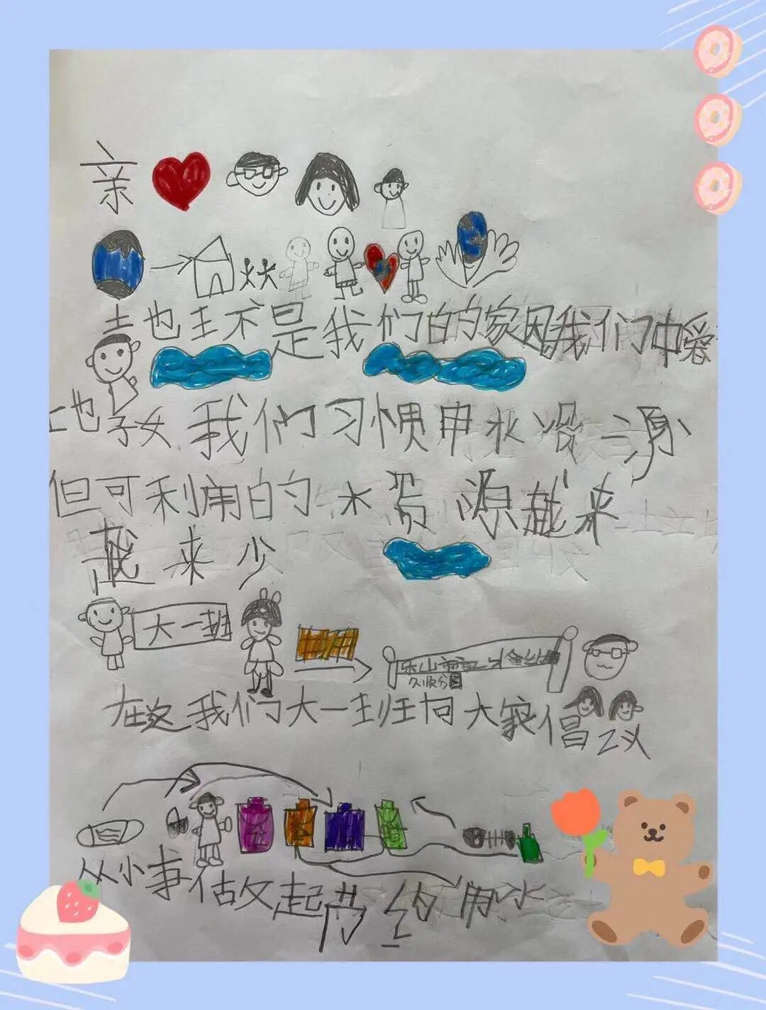 方梓亦:“水瓶里有水要喝完,不能丢掉。”