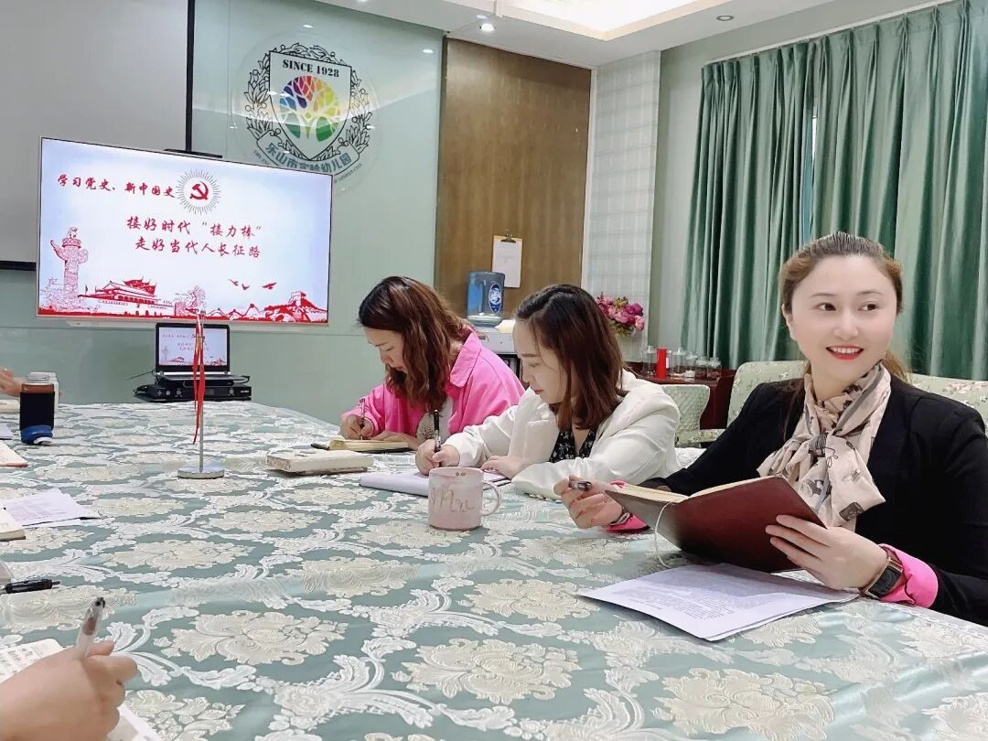 廖媛书记提到:面对党和国家事业发展新要求,重温党和人民共同走过的光辉历程,希望全体教师要汲取党史、国史中蕴藏着丰富的营养,进一步提高我们实幼教师干事创业的能力,提高为人民服务能力,最终为实现“四个全面”积极奉献力量。