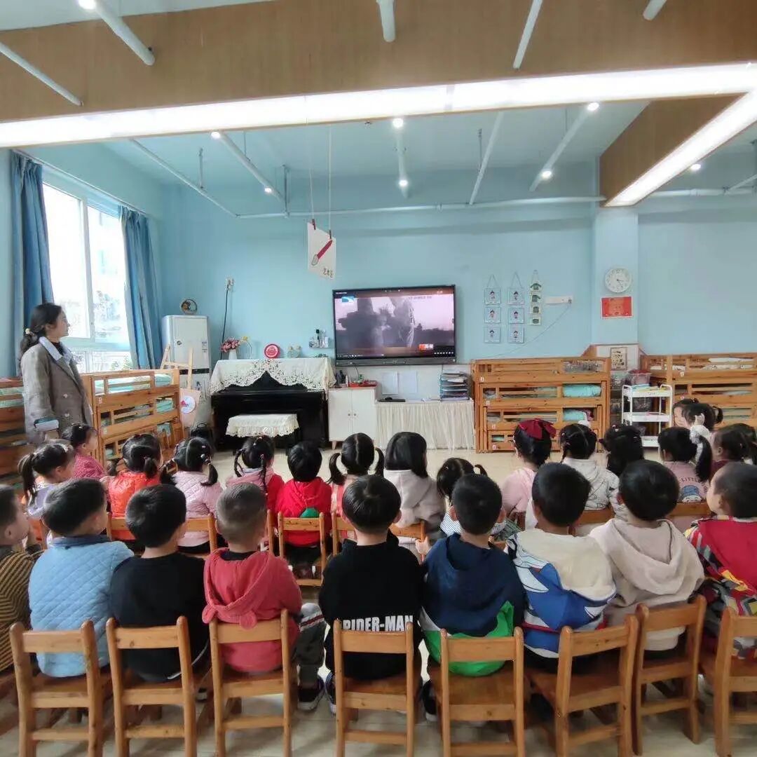 小班年级组举行了“红色电影”主题活动。老师根据幼儿年龄特点精心挑选了适合孩子们观看的《小兵张嘎》《红星闪闪》等红色经典影片与孩子们一起观看。观看中,孩子们被跌宕起伏的故事情节和鲜明的人物形象所吸引,位小英雄们爱憎分明、机智无畏的言行所感染。老师们通过解说、回放等方法帮助幼儿了解影片内容、历史背景,让孩子们铭记艰难岁月中的英雄们的感人事迹,使孩子们懂得了今天的幸福生活来之不易。