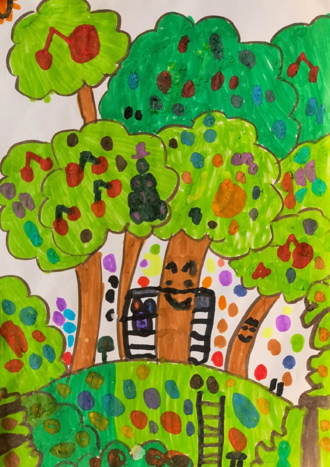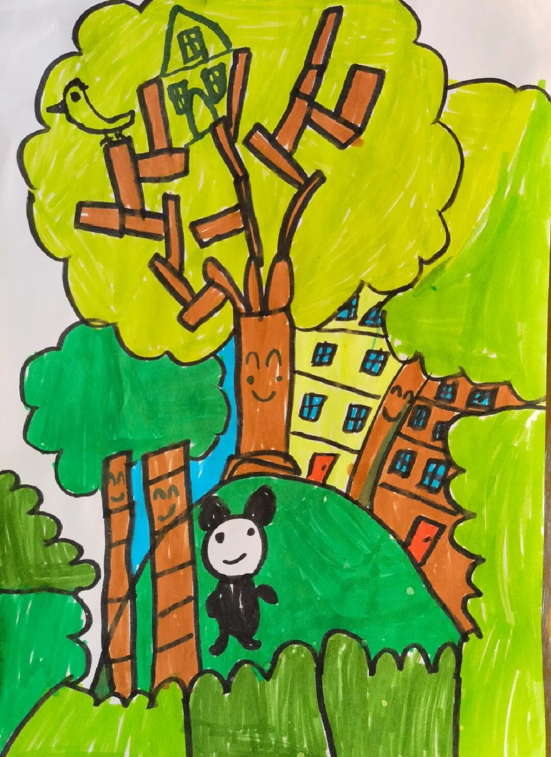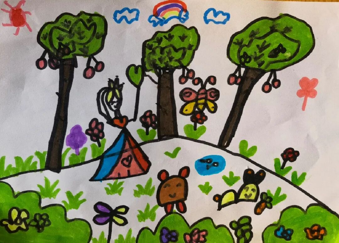 大地是绿色的,天空有彩虹,太阳公公露出了笑脸,大森林的大树,小动物和蝴蝶都开心极了。