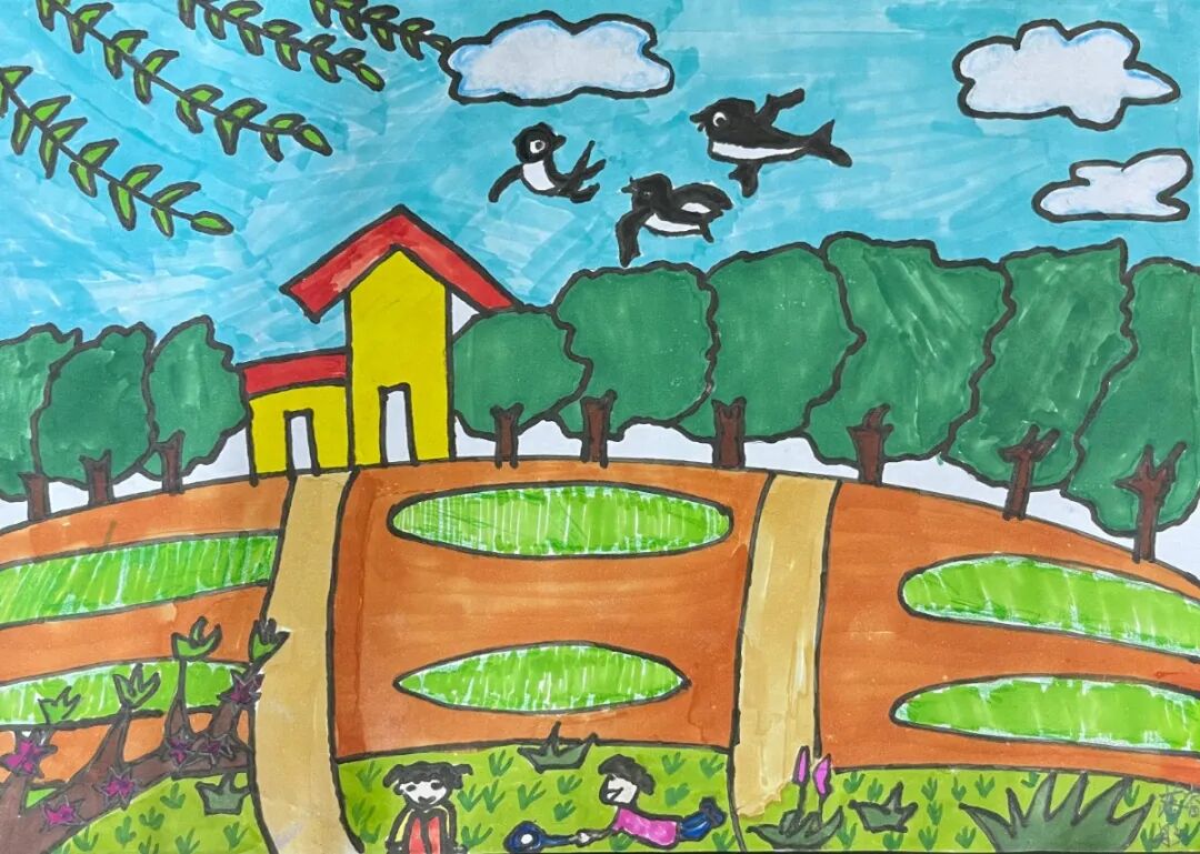落睿彤:春天到了,小燕子飞回来了,风轻轻吹着柳树,我和好朋友躺在草坪上享受着春天。