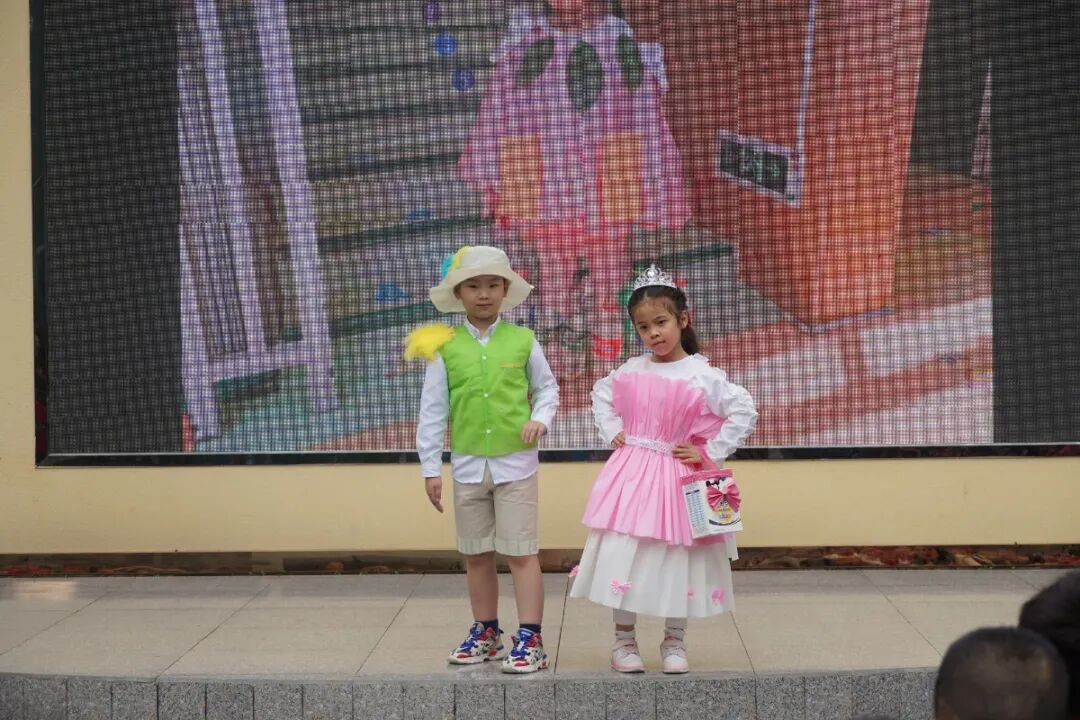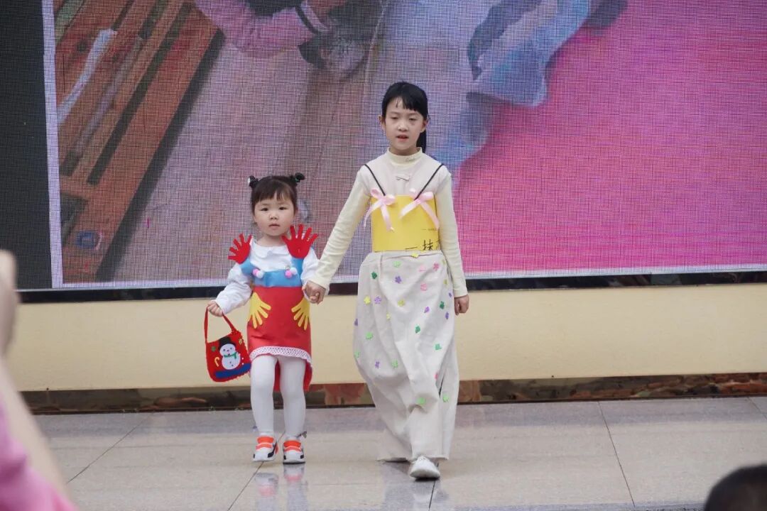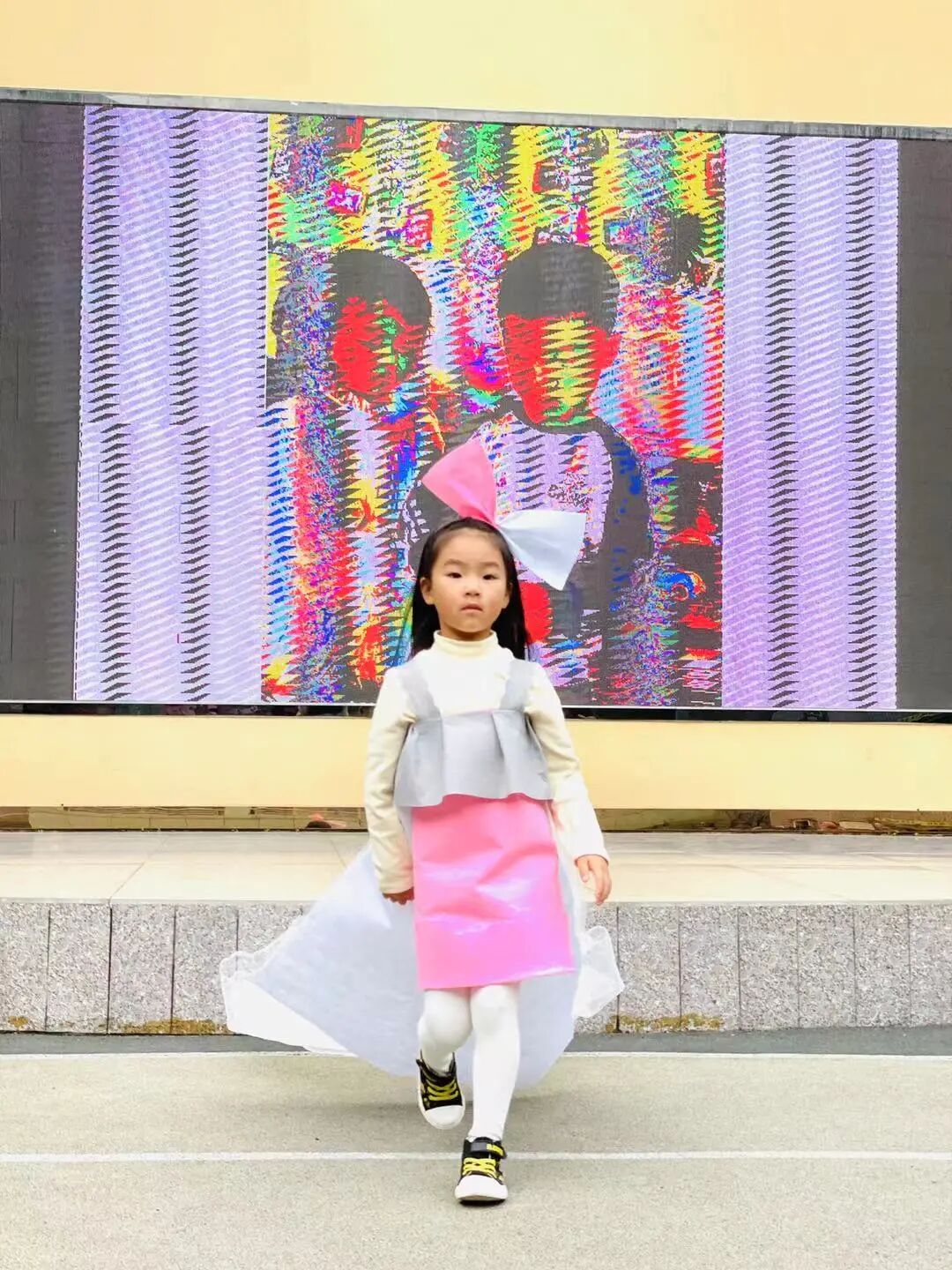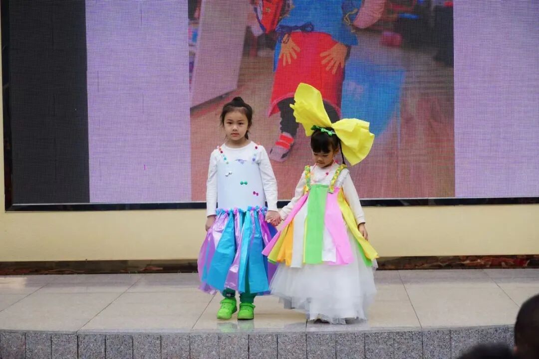 最后向我们展示的是中二班的服装:“今日橱窗款”,所用材料是废旧无纺布,纽扣,拉链,白纱。