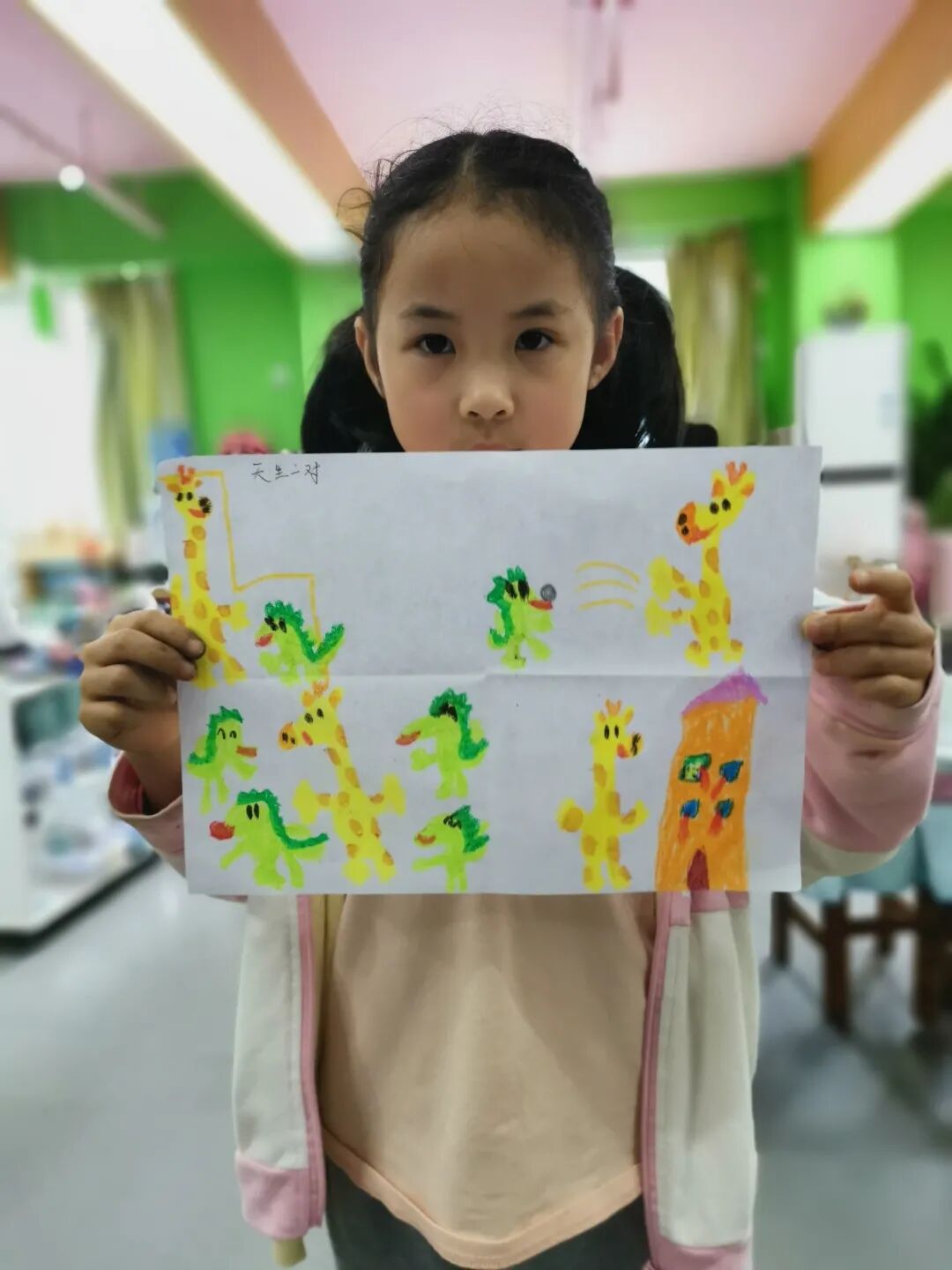 “我的是长颈鹿和绿色小刺猬!小刺猬变成绿色了长颈鹿就很好奇一直问它怎么做到的哈哈哈哈。”