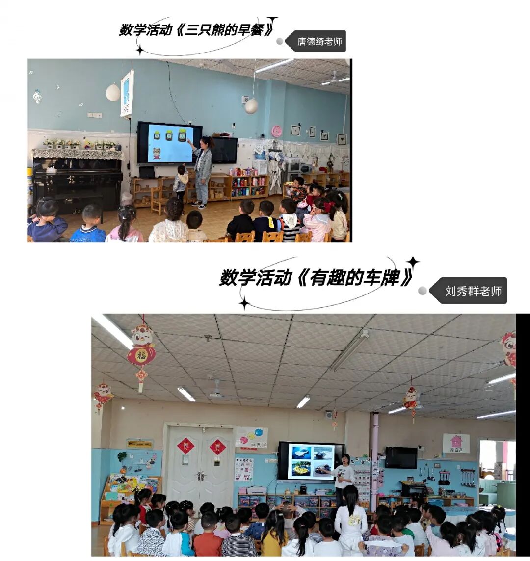 张老师把简单的故事,通过情景再现的方式为小朋友们演绎出来,生动形象,吸引了孩子的眼球,情节随着门的变化而变化,新房子的门也一扇一扇多了起来,结合比较和数量,孩子们在体验中快乐学习。