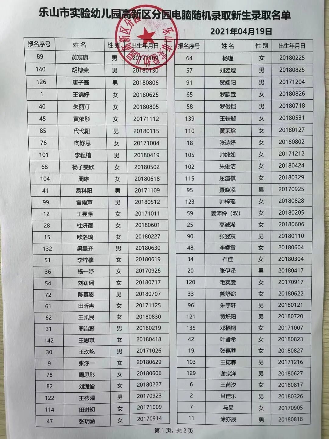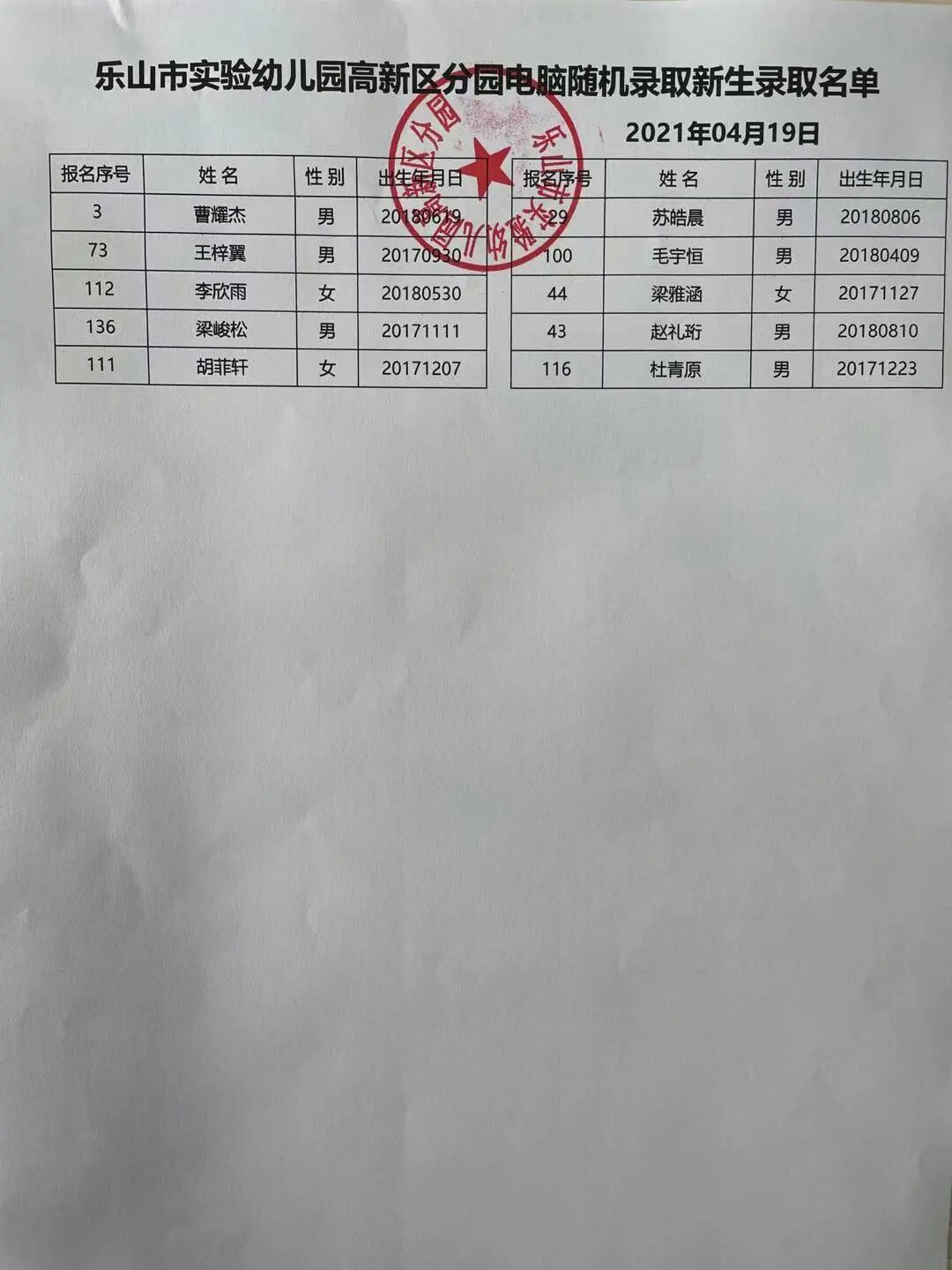 乐山市实验幼儿园高新区分园2021年电脑派位新生录取名单公示啦!