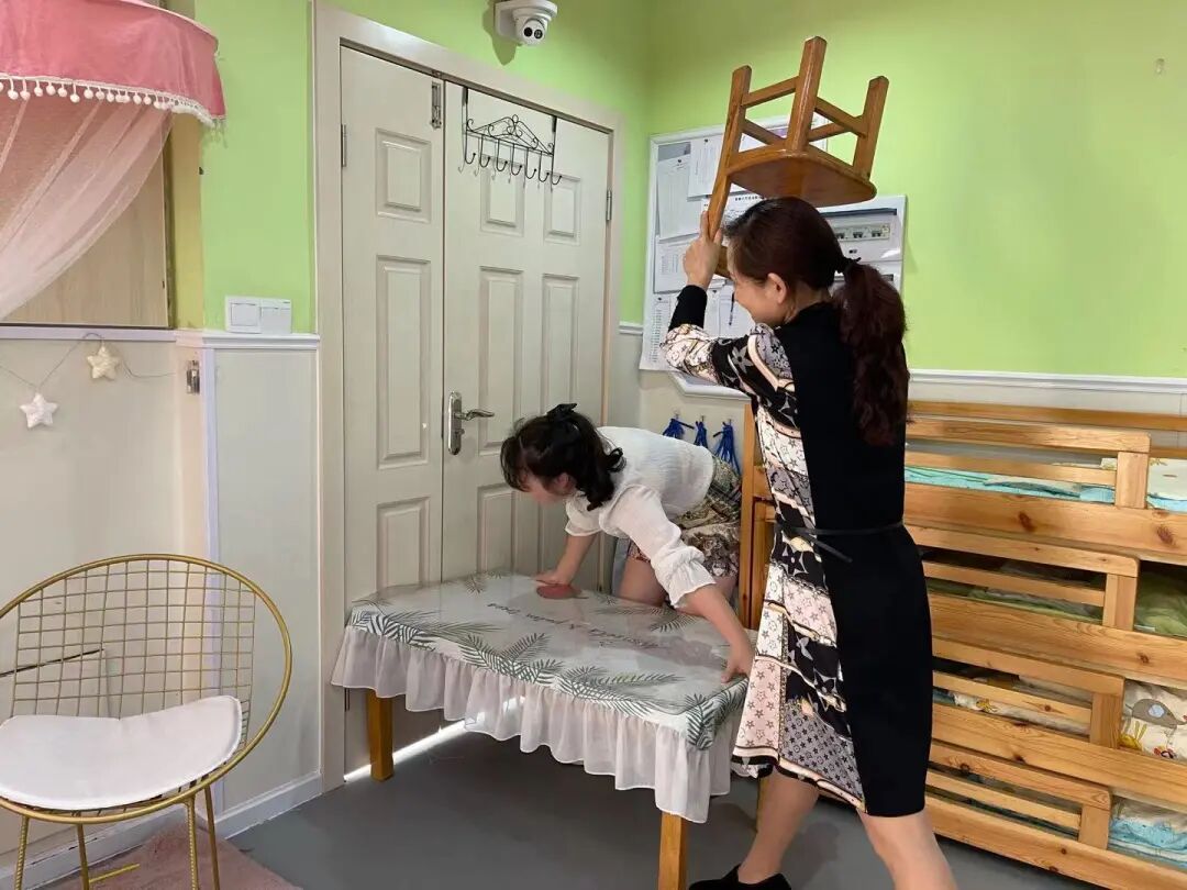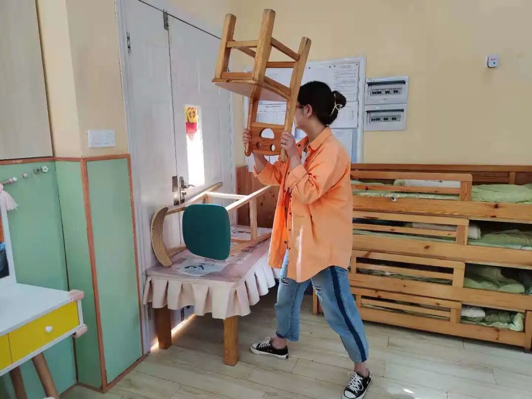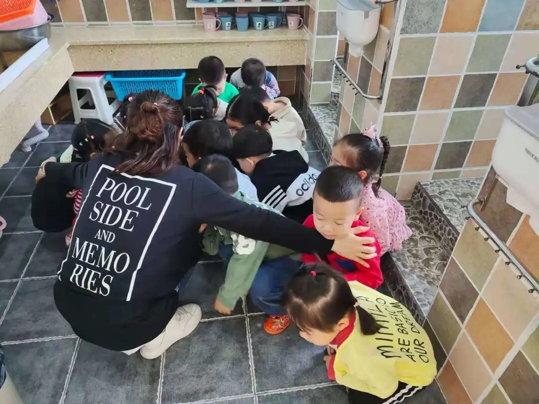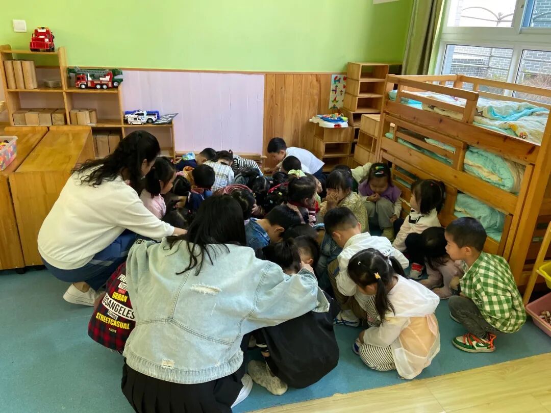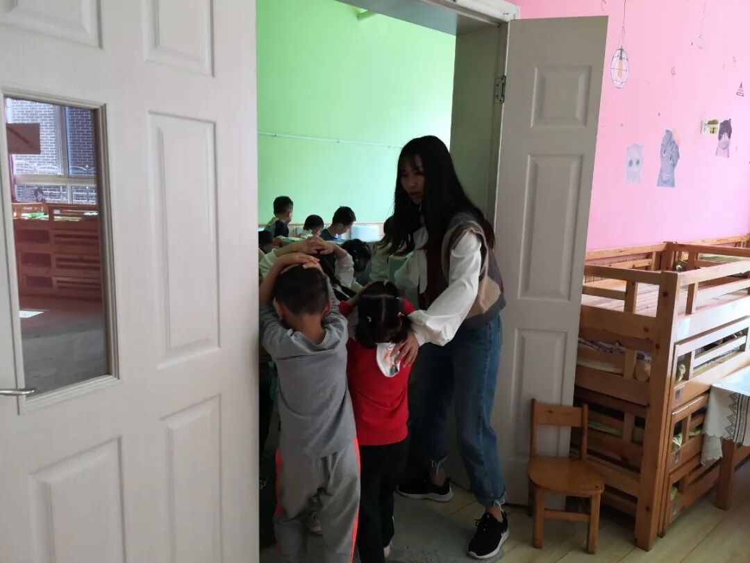 幼儿立即停止一切活动,在操场活动的班级,教师带领幼儿快速撤离躲进就近教室做好防护工作。两名教师立即关紧门窗,并用桌椅抵住门,手持幼儿椅子、木板、清洁工具等做好防护准备,另一教师组织幼儿躲避桌下、卫生间并稳定幼儿情绪。全园进入一级戒备状态。
