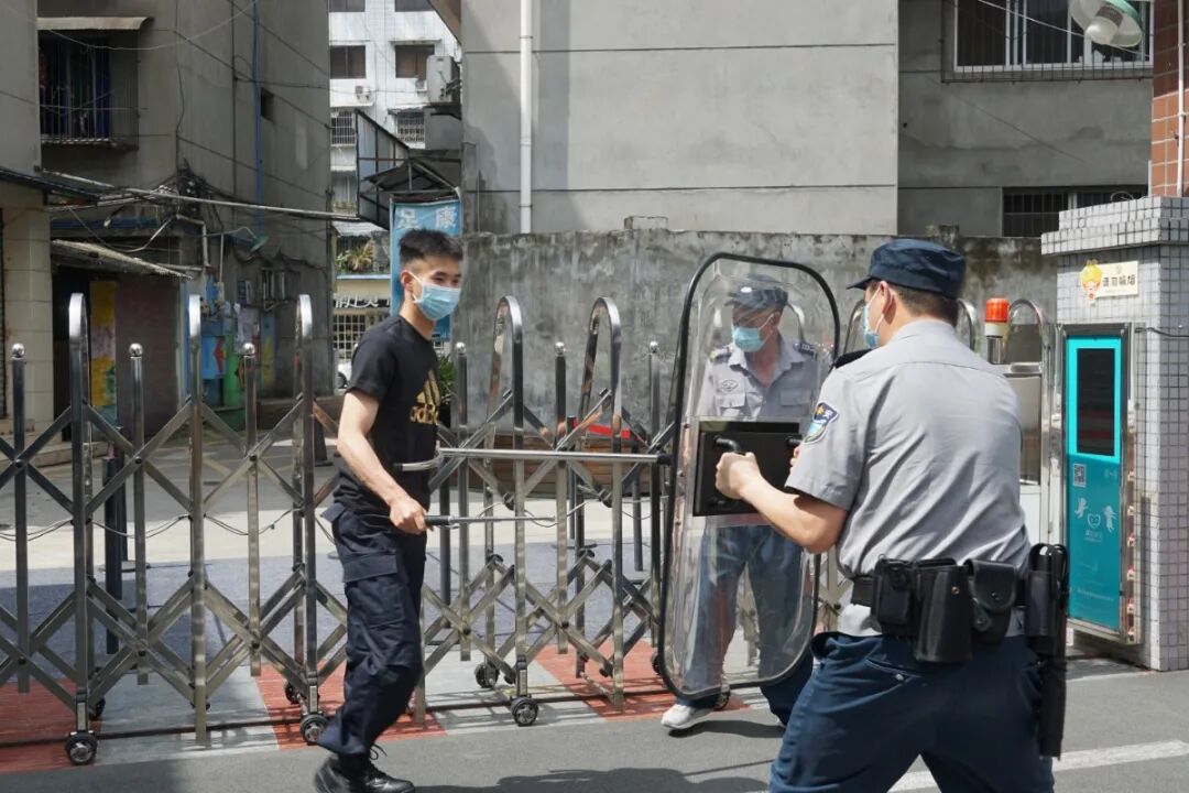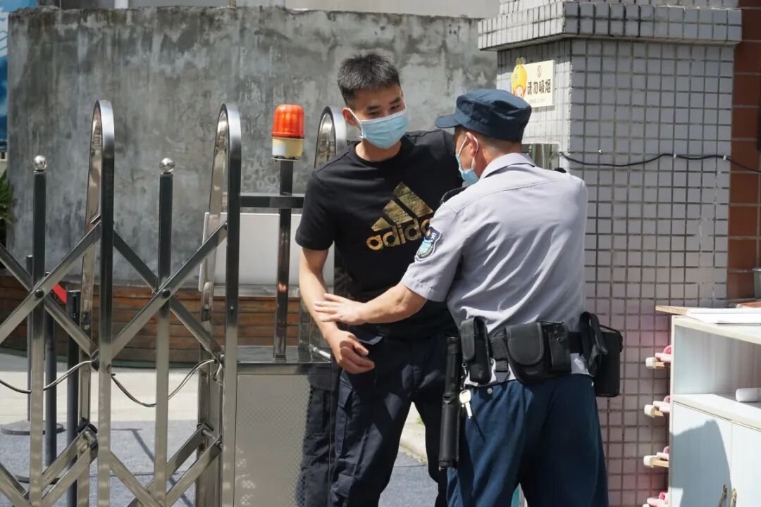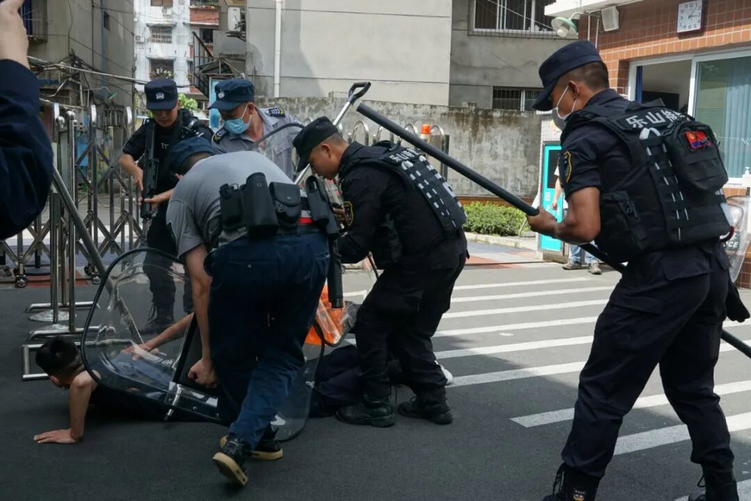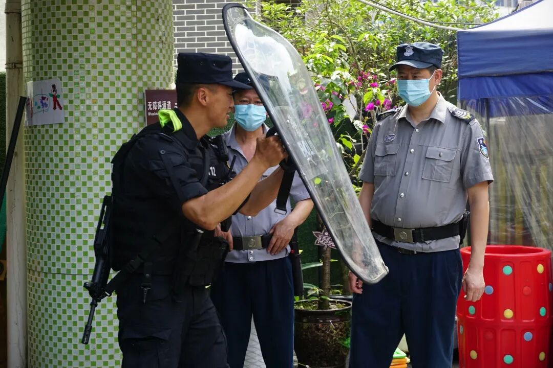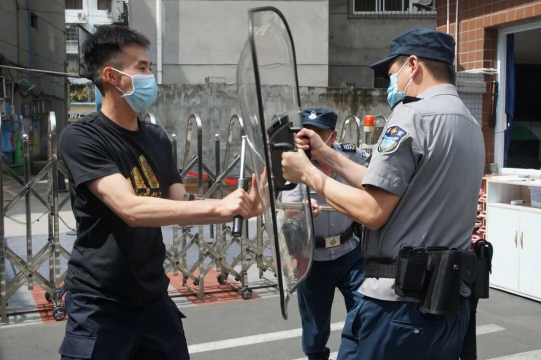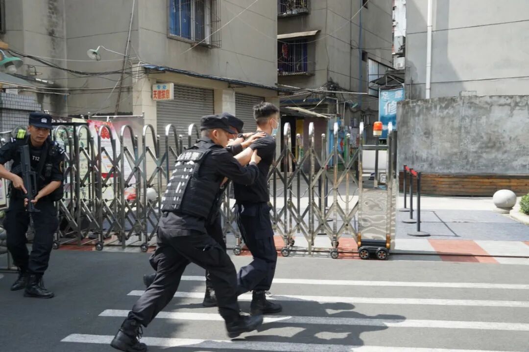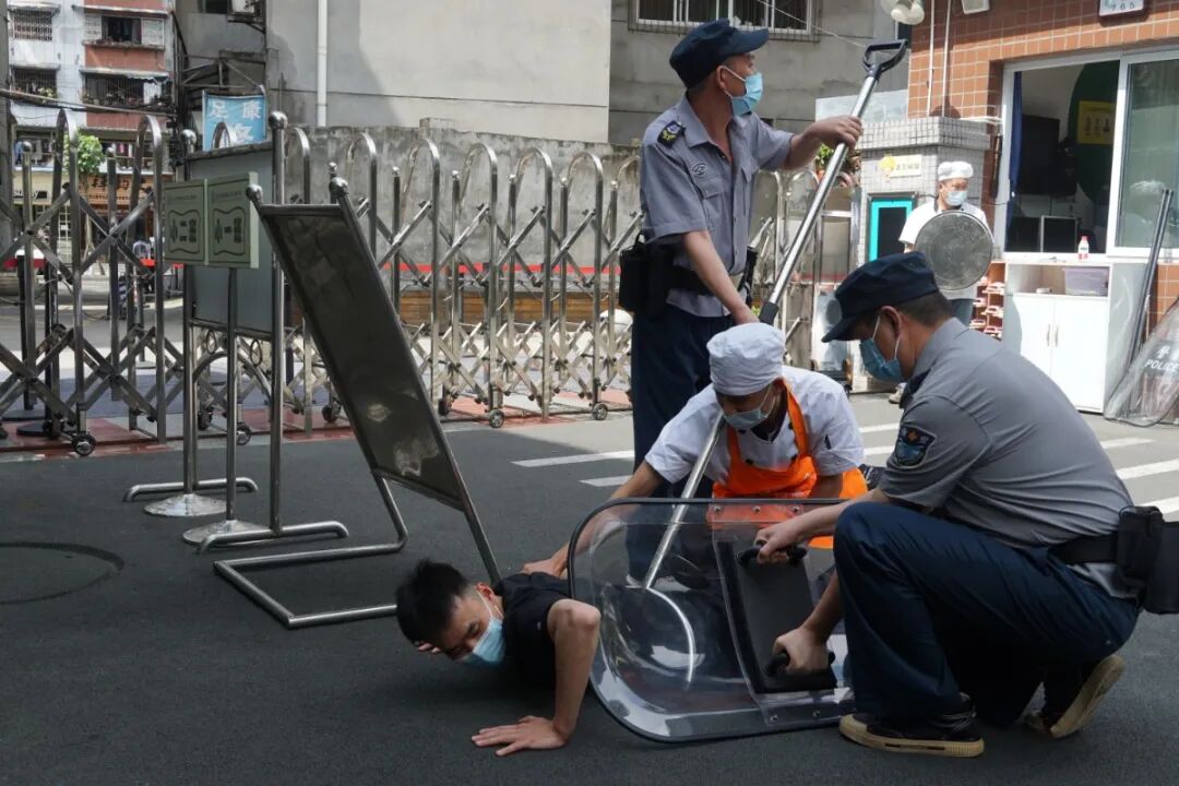 保安师傅与园内安全应急小组成员合力,包围“歹徒”,利用钢叉、防爆盾、警棍等专用防卫器械将“歹徒”制服。警察到来,将“歹徒”抓捕带离现场。