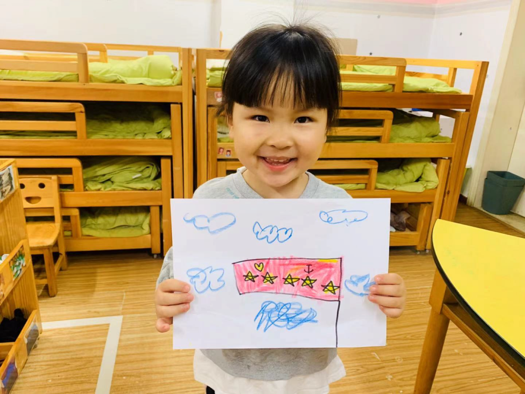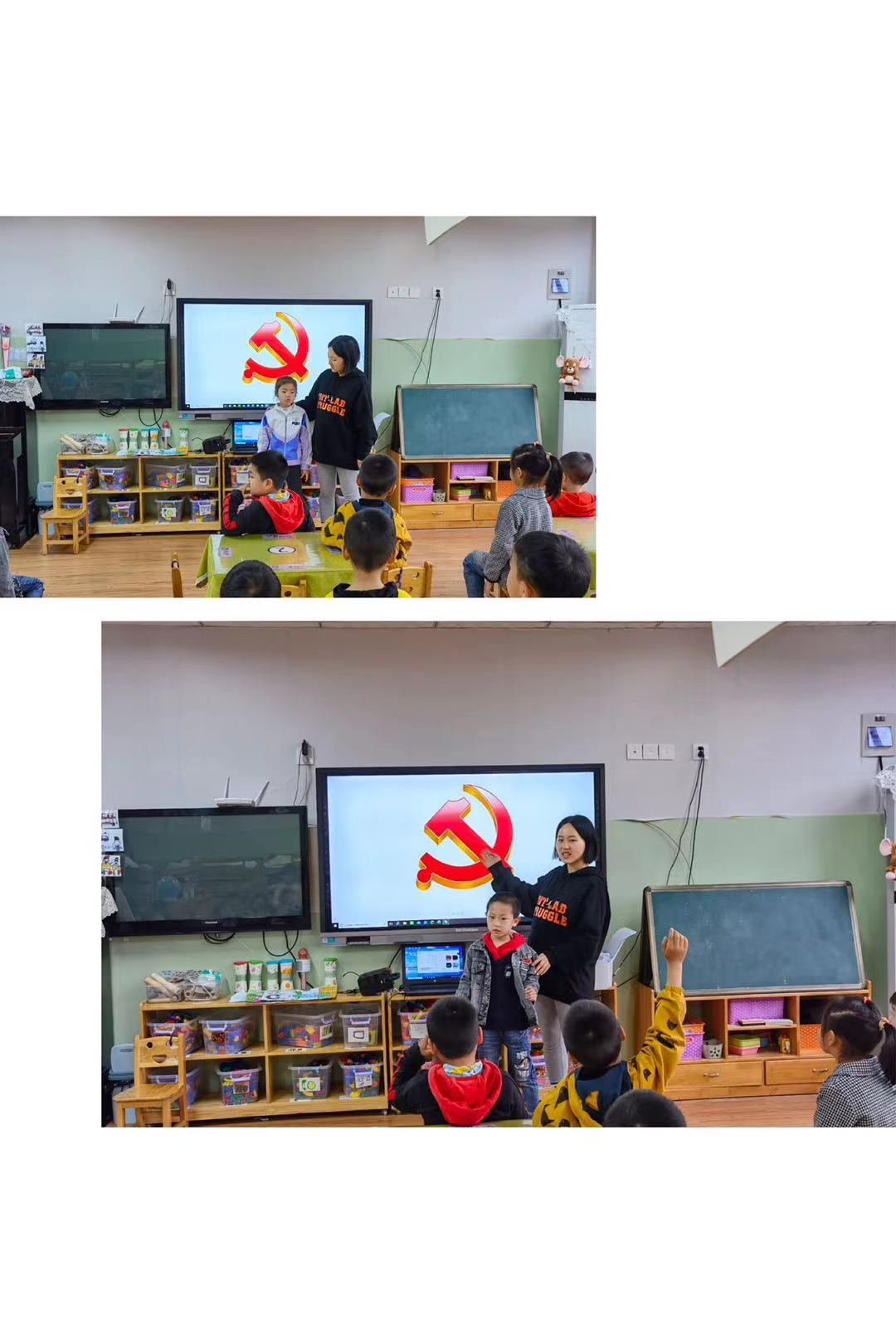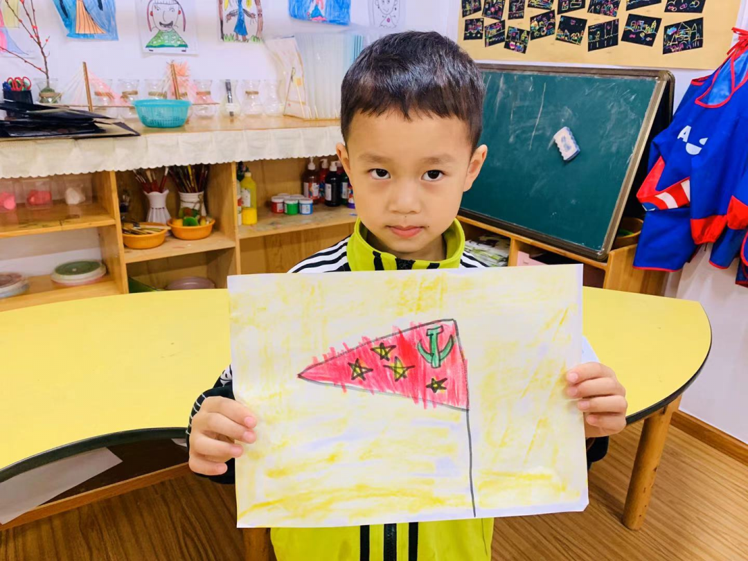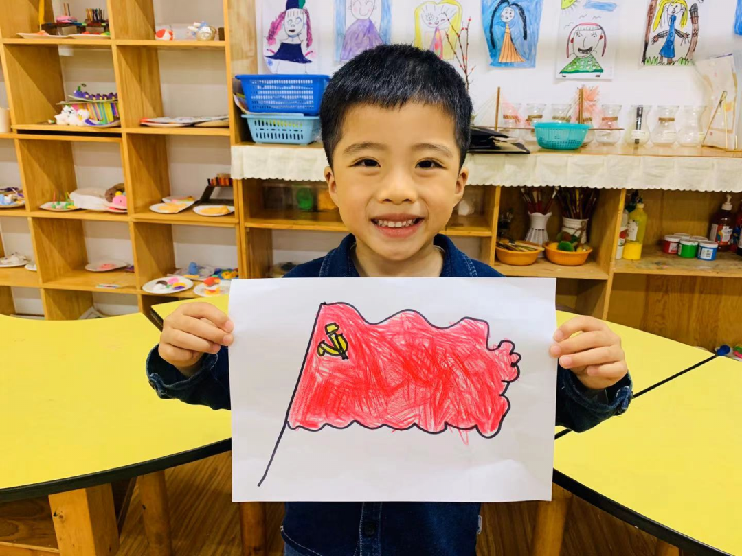 孩子们还通过手里的彩笔,画党旗,在一点一滴的过程中,他们认识党旗、了解党旗,知道党旗是中国共产党的象征和标志,最后和党旗合影,一张张笑脸燃起宝贝们对党最真挚的情感。