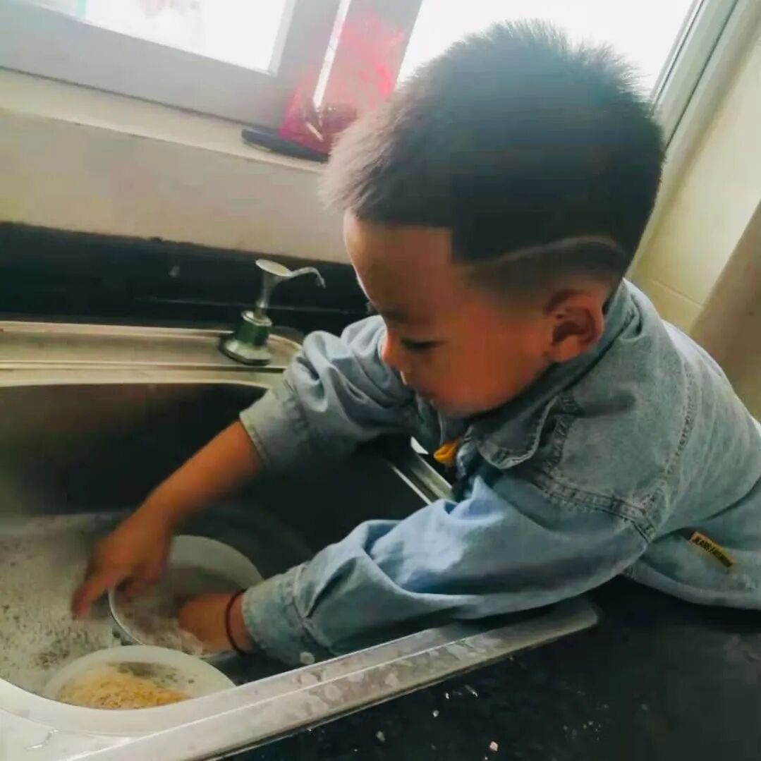 碗儿、盘儿谁来洗?“宝宝”休息,“爸爸”洗。