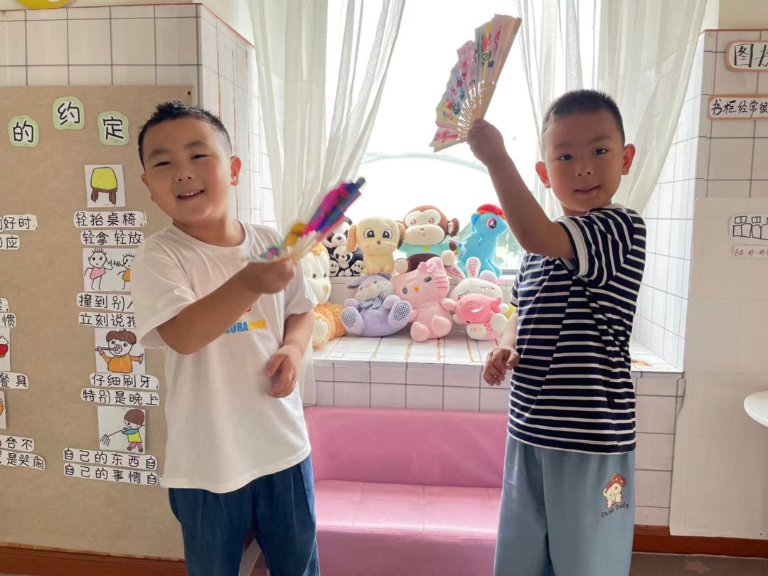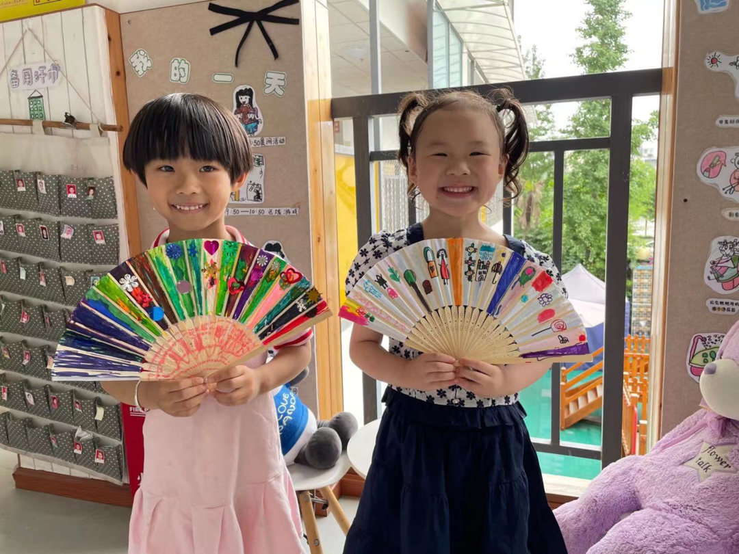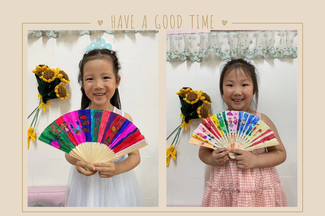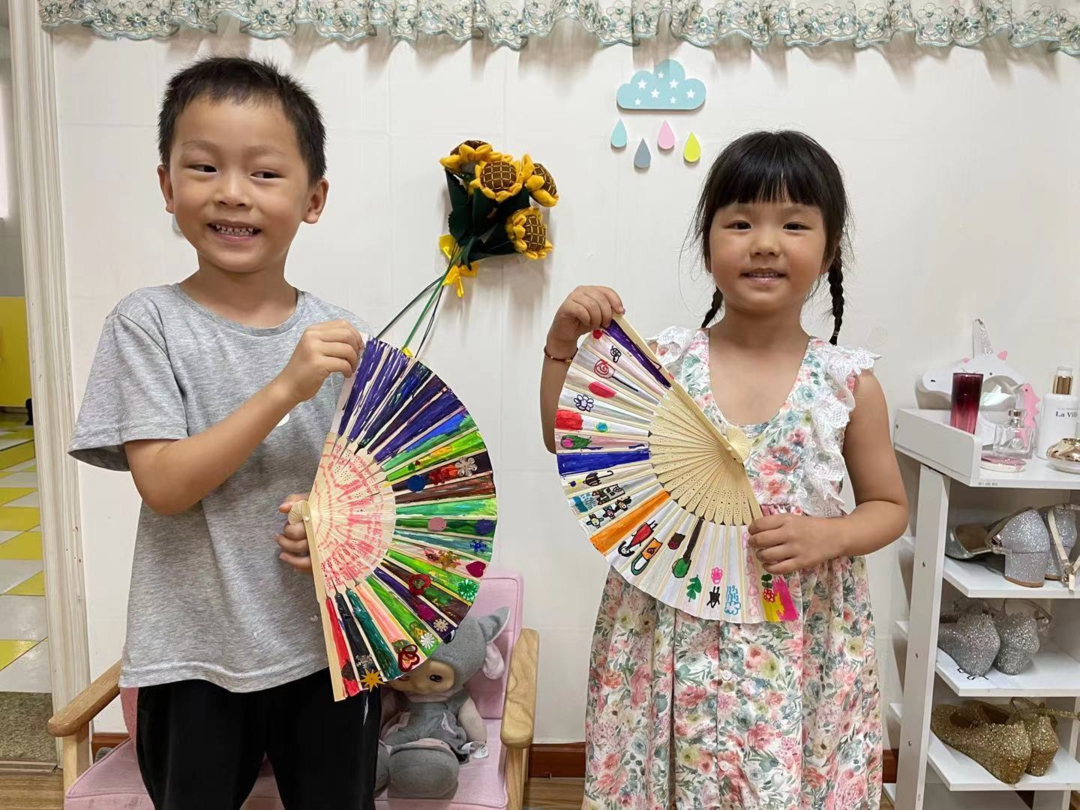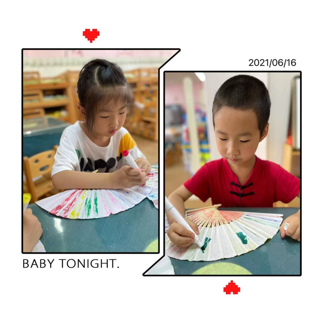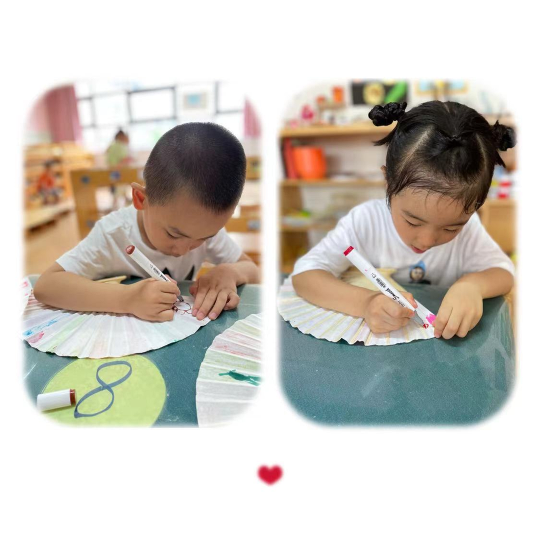 夏日炎炎,何以解暑?绘制一把属于自己的小扇子,送上一丝清凉。孩子们在老师介绍完夏至习俗和制作折扇的材料后,他们兴致勃勃的动了起来,一笔一画,精心装饰着自己的团扇。