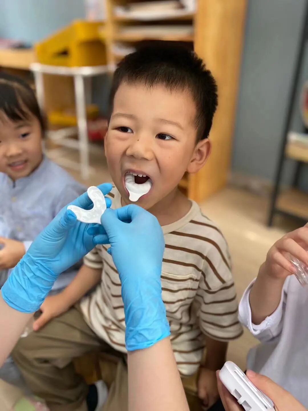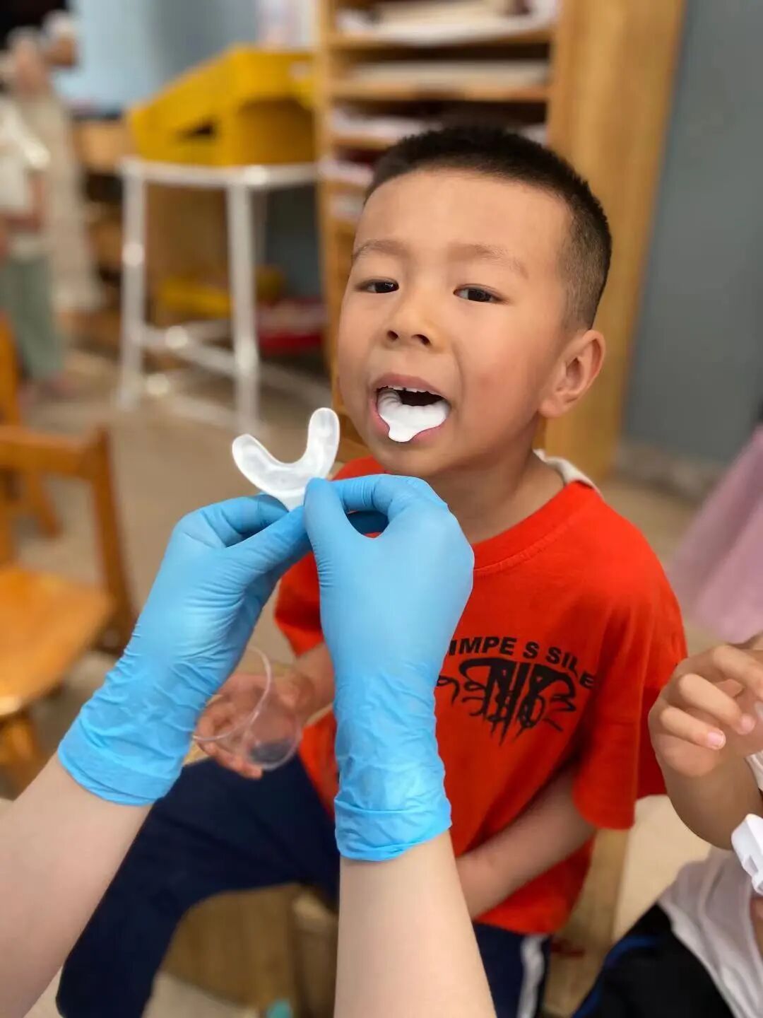 在医生正确引导和各班教师认真组织下,每一位幼儿都进行了口腔状况检查及涂氟防。孩子们张大嘴巴,按要求咬住含有氟化泡沫的牙托,勇敢的配合医生的工作。整个过程井然有序,孩子们的表现也得到了医生们的表扬。