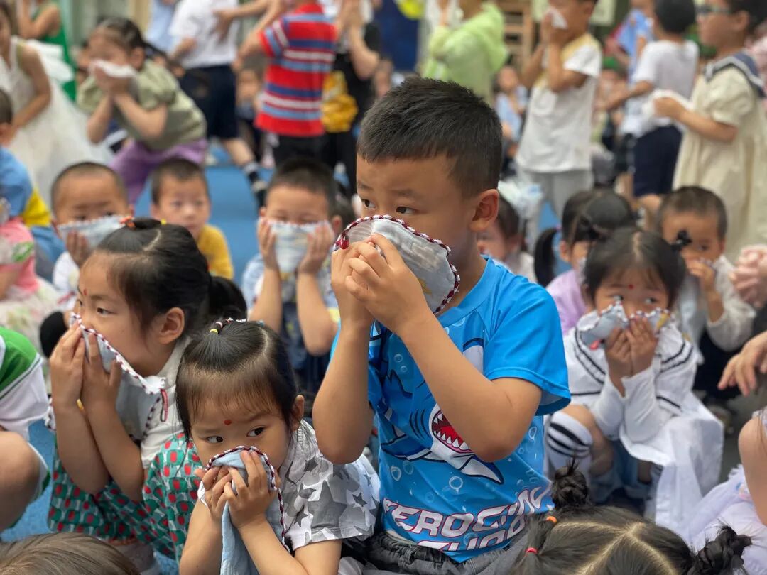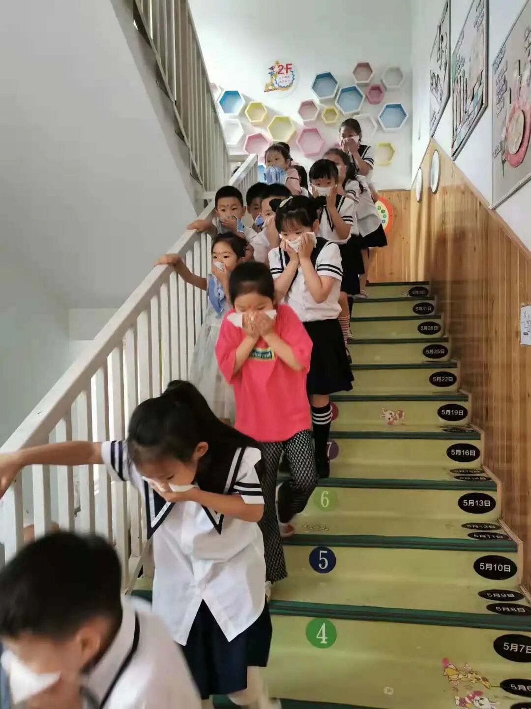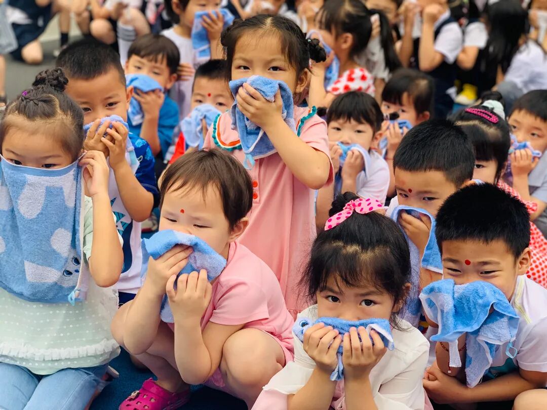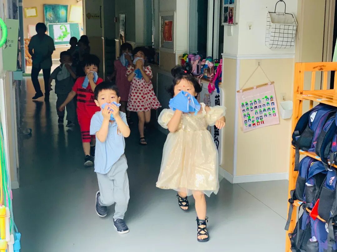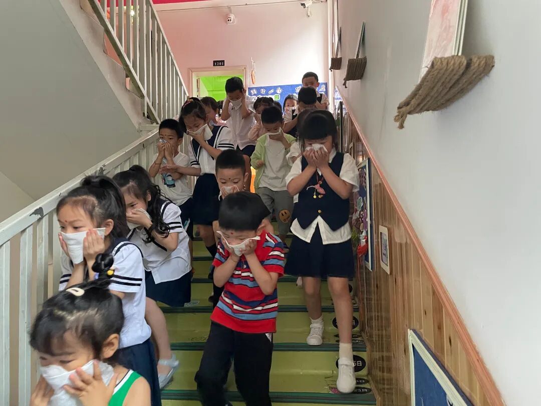 随着警报响起,小朋友们在老师的带领下用湿毛巾捂着口鼻,压低身体,按指定的路线从教室里快速疏散到安全地带。