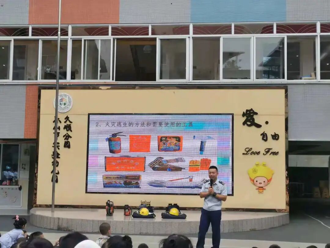 随后,消防员叔叔通过图片、短片告诉孩子们火灾时逃生的方法和如何避免火灾的发生;讲解了各种消防器械、消防服的用途。