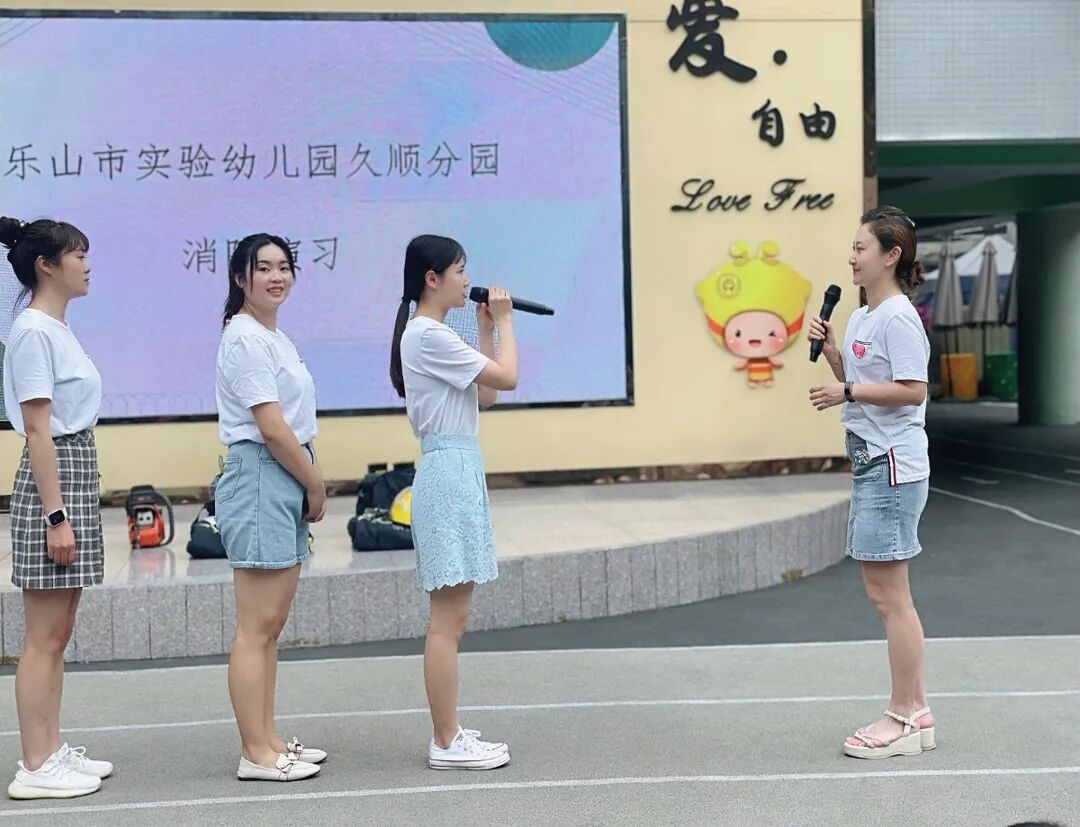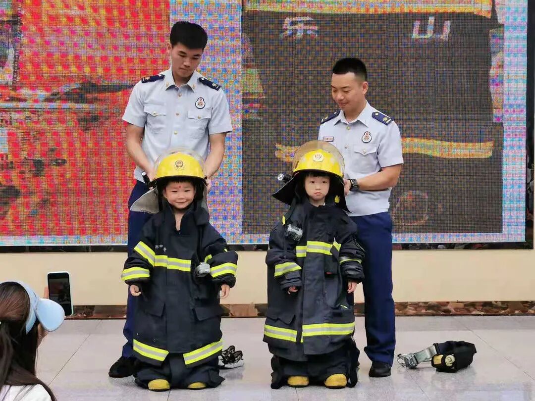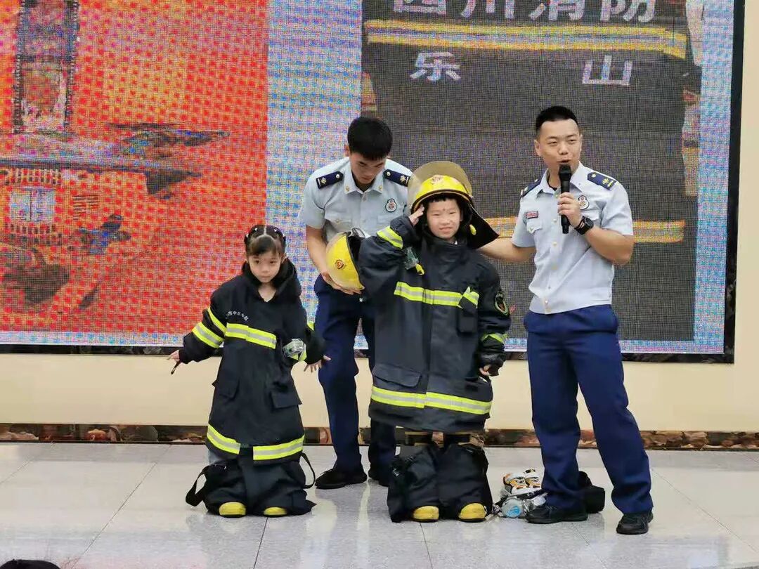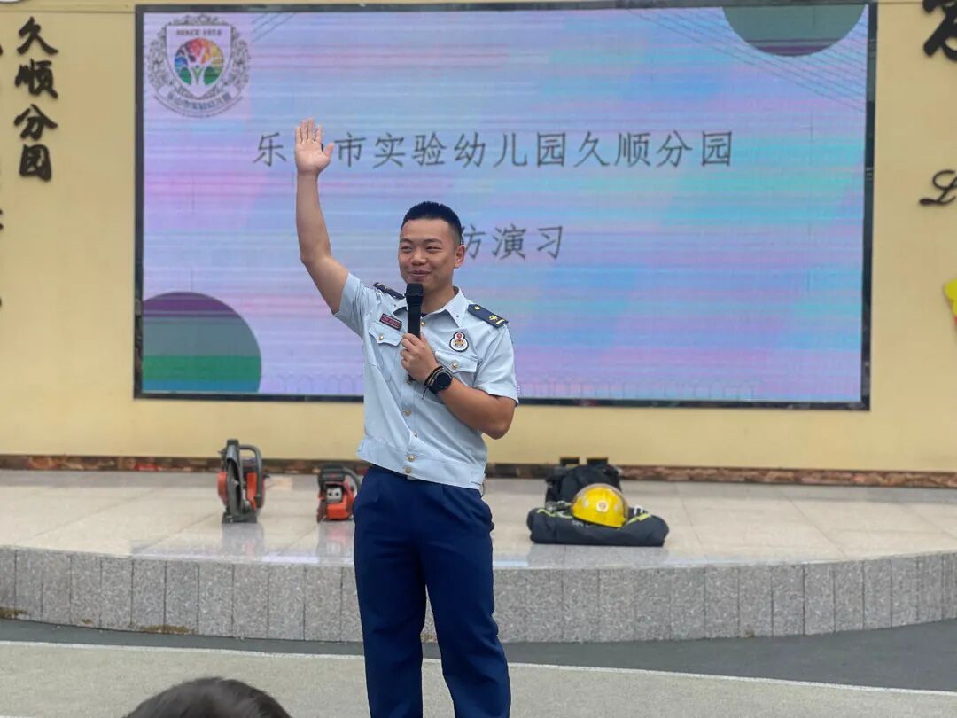 近日, 乐山市市中区消防救援站的消防官兵走进乐山市实验幼儿园久顺分园和孩子们、老师们一同开展消防演习活动。